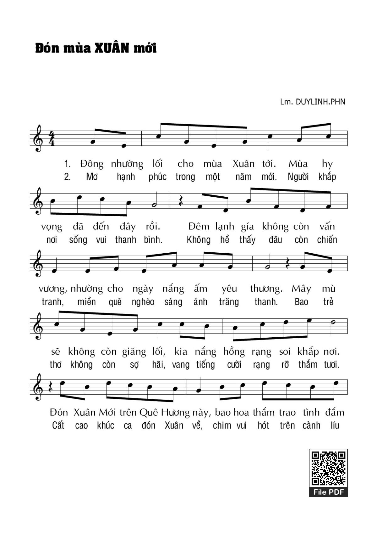 Sheet music Đón mùa xuân mới by Duy Linh PHN and PDF file was posted here to support you to practice singing perfectly. Sheets with notes and chords are for reference only, for non-commercial purposes only, not involved with earning money by buying and selling. Copyright is belong to song writer/author and copyright owner. Truongca.com do not own any copyrighted content. You can download the high-quality PDF files which contain staffs by PDF link above.
