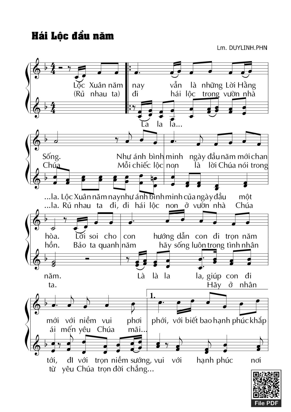 Sheet music Hái lộc đầu năm by Duy Linh PHN and PDF file was posted here to support you to practice singing perfectly. Sheets with notes and chords are for reference only, for non-commercial purposes only, not involved with earning money by buying and selling. Copyright is belong to song writer/author and copyright owner. Truongca.com do not own any copyrighted content. You can download the high-quality PDF files which contain staffs by PDF link above.