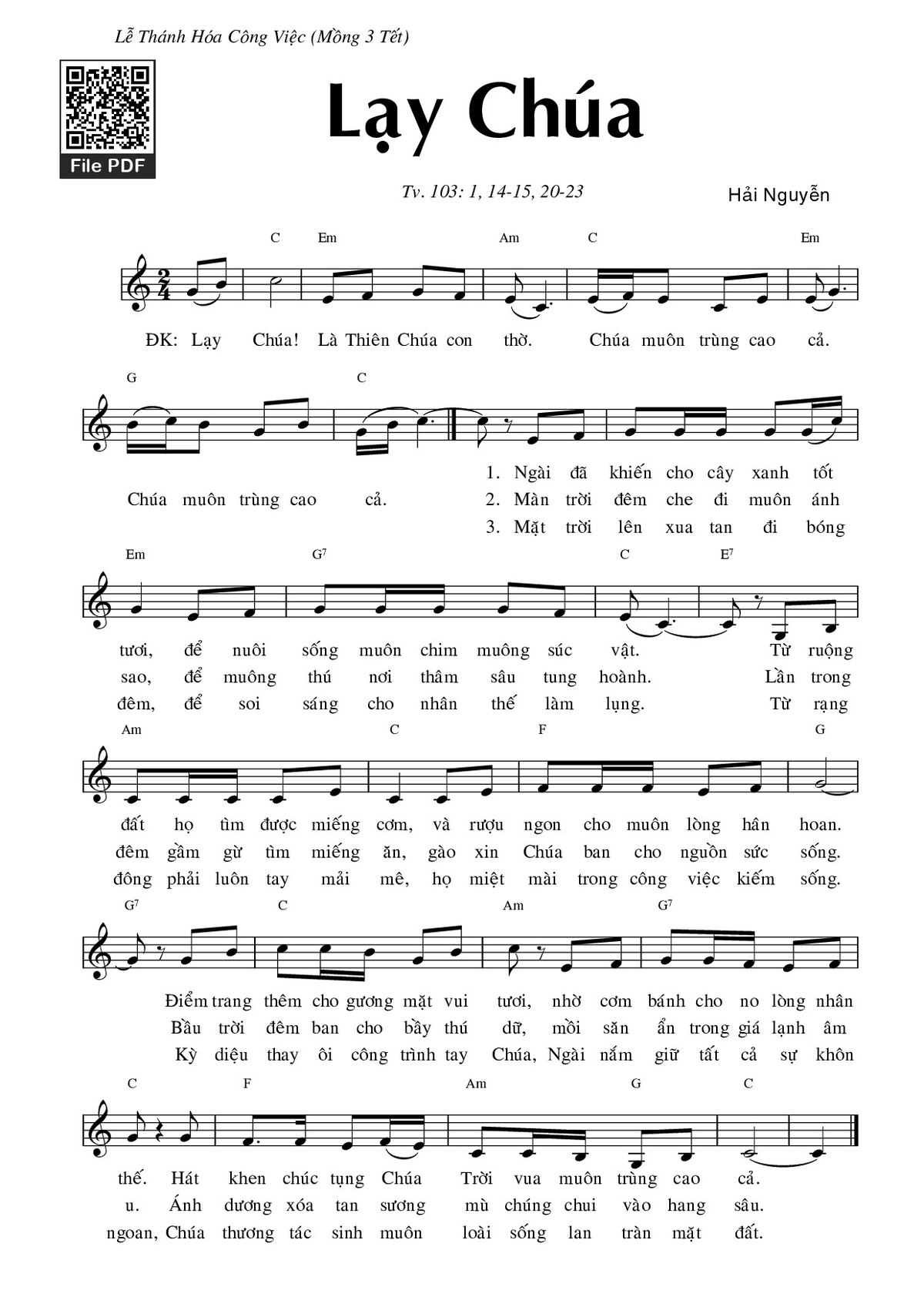 Sheet music Lạy Chúa (Tv. 103) by Hải Nguyễn and PDF file was posted here to support you to practice singing perfectly. Sheets with notes and chords are for reference only, for non-commercial purposes only, not involved with earning money by buying and selling. Copyright is belong to song writer/author and copyright owner. Truongca.com do not own any copyrighted content. You can download the high-quality PDF files which contain staffs by PDF link above.