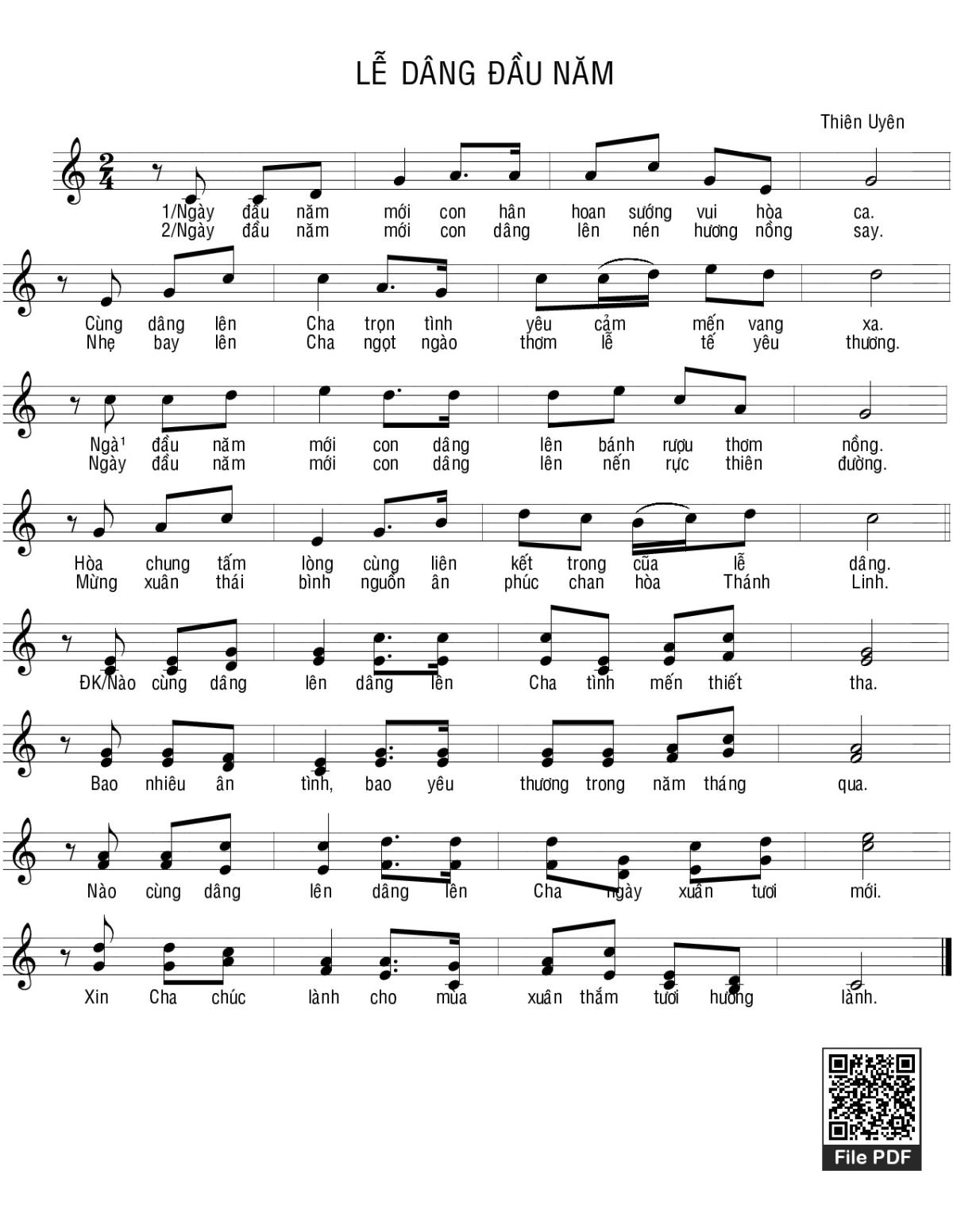 Sheet music Lễ dâng đầu năm by Thiên Uyên and PDF file was posted here to support you to practice singing perfectly. Sheets with notes and chords are for reference only, for non-commercial purposes only, not involved with earning money by buying and selling. Copyright is belong to song writer/author and copyright owner. Truongca.com do not own any copyrighted content. You can download the high-quality PDF files which contain staffs by PDF link above.