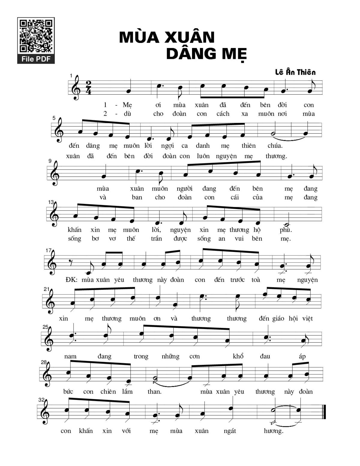 Sheet music Mùa xuân dâng Mẹ by Lê Ân Thiên and PDF file was posted here to support you to practice singing perfectly. Sheets with notes and chords are for reference only, for non-commercial purposes only, not involved with earning money by buying and selling. Copyright is belong to song writer/author and copyright owner. Truongca.com do not own any copyrighted content. You can download the high-quality PDF files which contain staffs by PDF link above.
