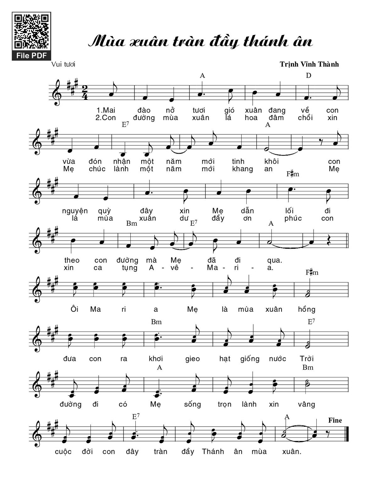 Sheet music Mùa xuân tràn đầy thánh ân by Trịnh Vĩnh Thành and PDF file was posted here to support you to practice singing perfectly. Sheets with notes and chords are for reference only, for non-commercial purposes only, not involved with earning money by buying and selling. Copyright is belong to song writer/author and copyright owner. Truongca.com do not own any copyrighted content. You can download the high-quality PDF files which contain staffs by PDF link above.