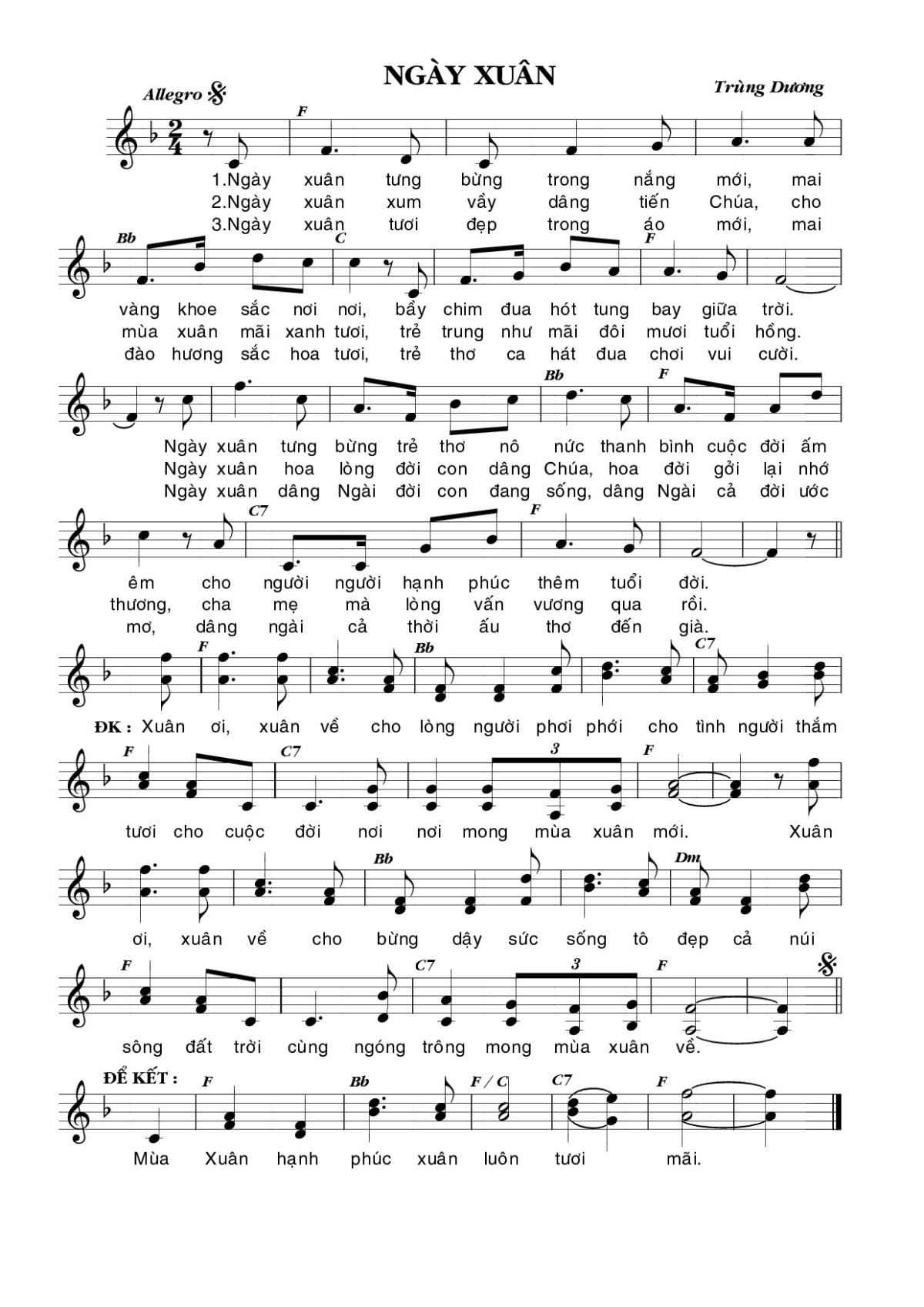 Sheet music Ngày xuân by Trùng Dương and PDF file was posted here to support you to practice singing perfectly. Sheets with notes and chords are for reference only, for non-commercial purposes only, not involved with earning money by buying and selling. Copyright is belong to song writer/author and copyright owner. Truongca.com do not own any copyrighted content. You can download the high-quality PDF files which contain staffs by PDF link above.
