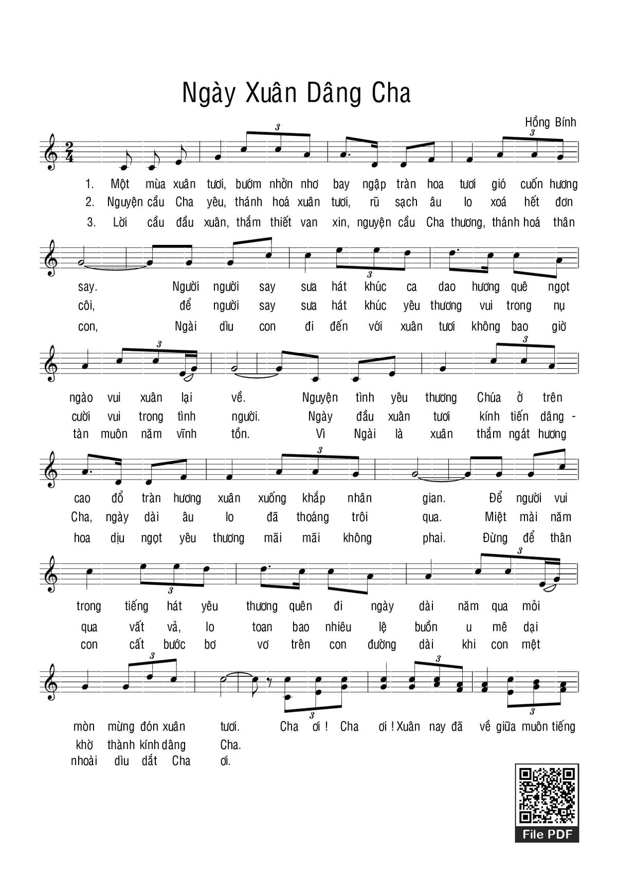 Sheet music Ngày xuân dâng Ch by Hồng Bính and PDF file was posted here to support you to practice singing perfectly. Sheets with notes and chords are for reference only, for non-commercial purposes only, not involved with earning money by buying and selling. Copyright is belong to song writer/author and copyright owner. Truongca.com do not own any copyrighted content. You can download the high-quality PDF files which contain staffs by PDF link above.