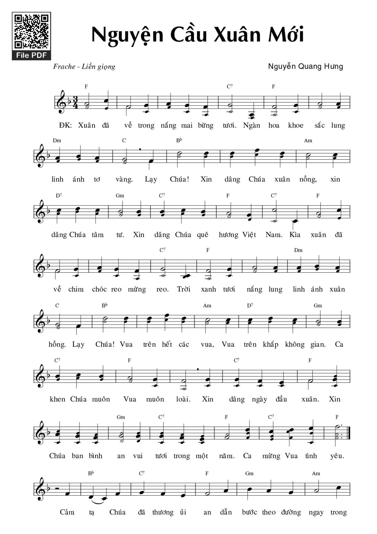 Sheet music Nguyện cầu xuân mới by Nguyễn Quang Hưng and PDF file was posted here to support you to practice singing perfectly. Sheets with notes and chords are for reference only, for non-commercial purposes only, not involved with earning money by buying and selling. Copyright is belong to song writer/author and copyright owner. Truongca.com do not own any copyrighted content. You can download the high-quality PDF files which contain staffs by PDF link above.