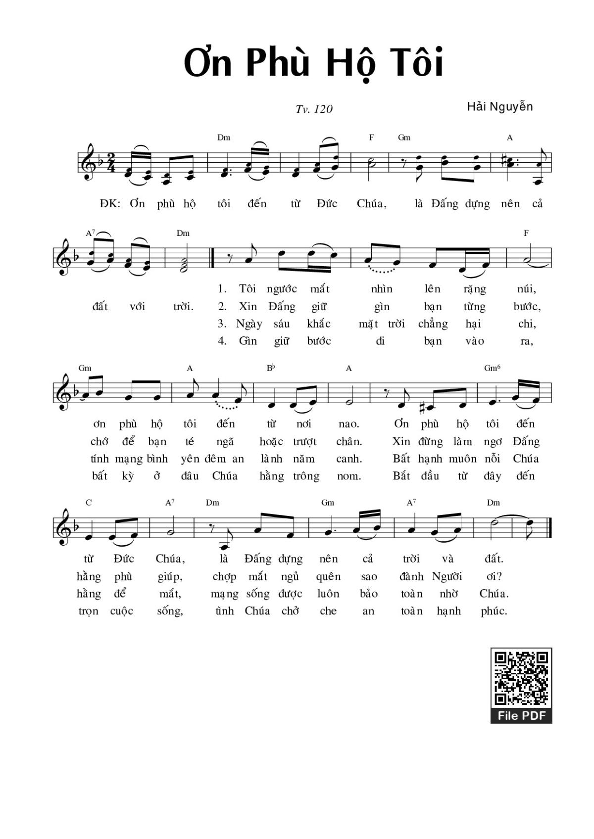 Sheet music Ơn phù hộ tôi (Tv 120) by Hải Nguyễn and PDF file was posted here to support you to practice singing perfectly. Sheets with notes and chords are for reference only, for non-commercial purposes only, not involved with earning money by buying and selling. Copyright is belong to song writer/author and copyright owner. Truongca.com do not own any copyrighted content. You can download the high-quality PDF files which contain staffs by PDF link above.