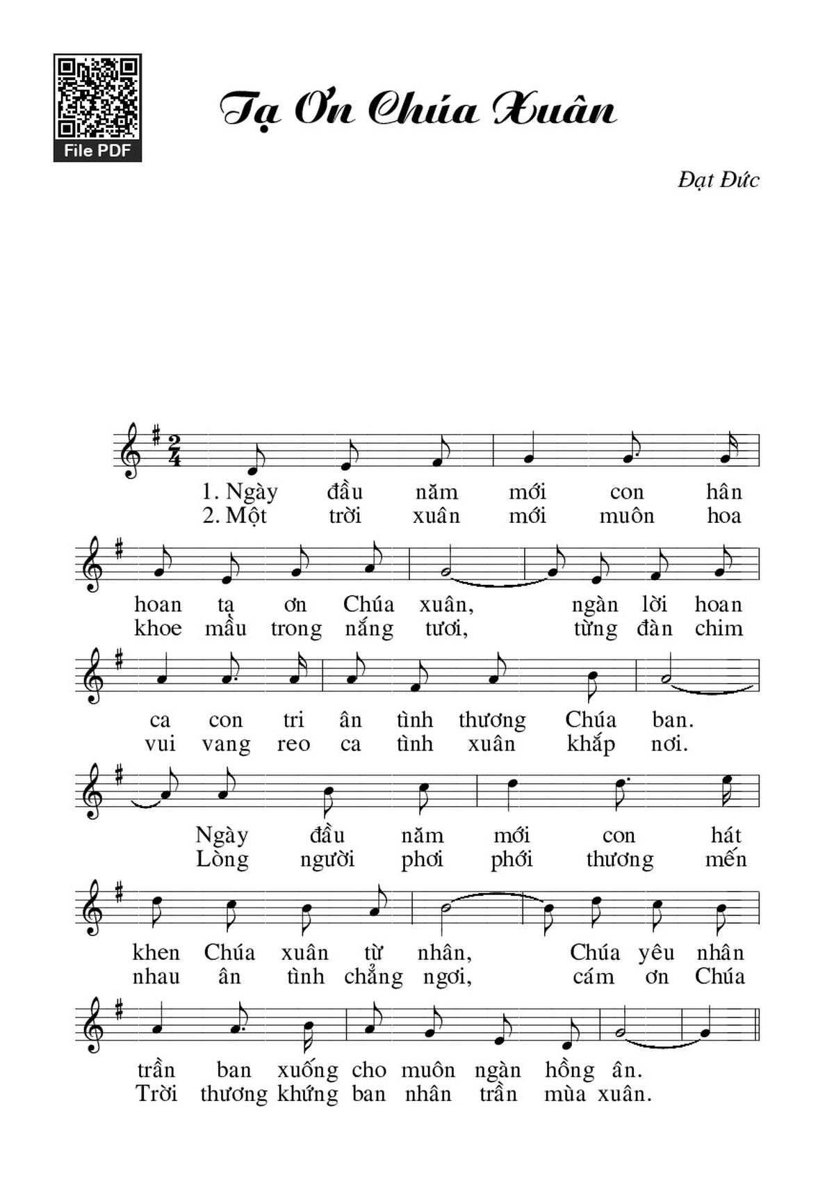 Sheet music Tạ ơn Chúa Xuân by Đạt ĐứcTạ ơn Chúa XuânGiang Tâm and PDF file was posted here to support you to practice singing perfectly. Sheets with notes and chords are for reference only, for non-commercial purposes only, not involved with earning money by buying and selling. Copyright is belong to song writer/author and copyright owner. Truongca.com do not own any copyrighted content. You can download the high-quality PDF files which contain staffs by PDF link above.