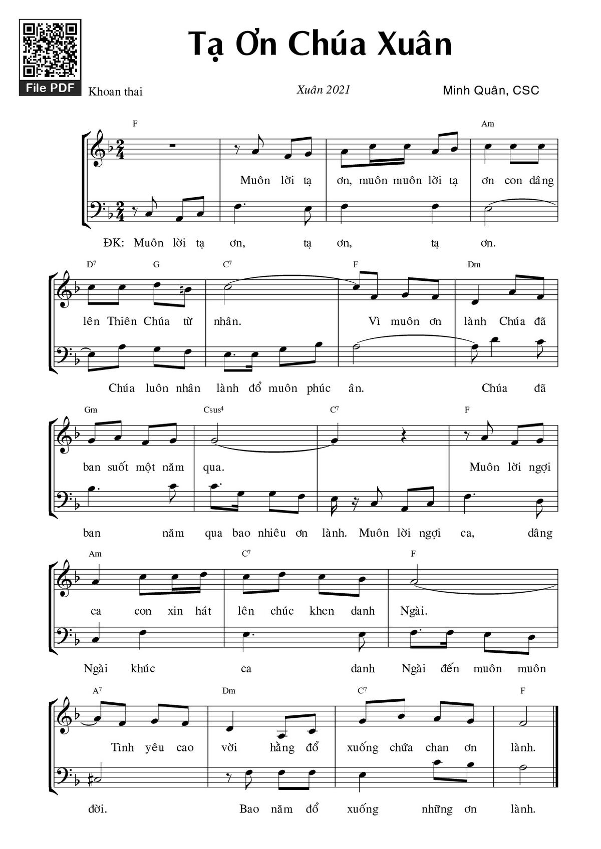 Sheet music Tạ ơn Chúa Xuân by Minh Quân and PDF file was posted here to support you to practice singing perfectly. Sheets with notes and chords are for reference only, for non-commercial purposes only, not involved with earning money by buying and selling. Copyright is belong to song writer/author and copyright owner. Truongca.com do not own any copyrighted content. You can download the high-quality PDF files which contain staffs by PDF link above.