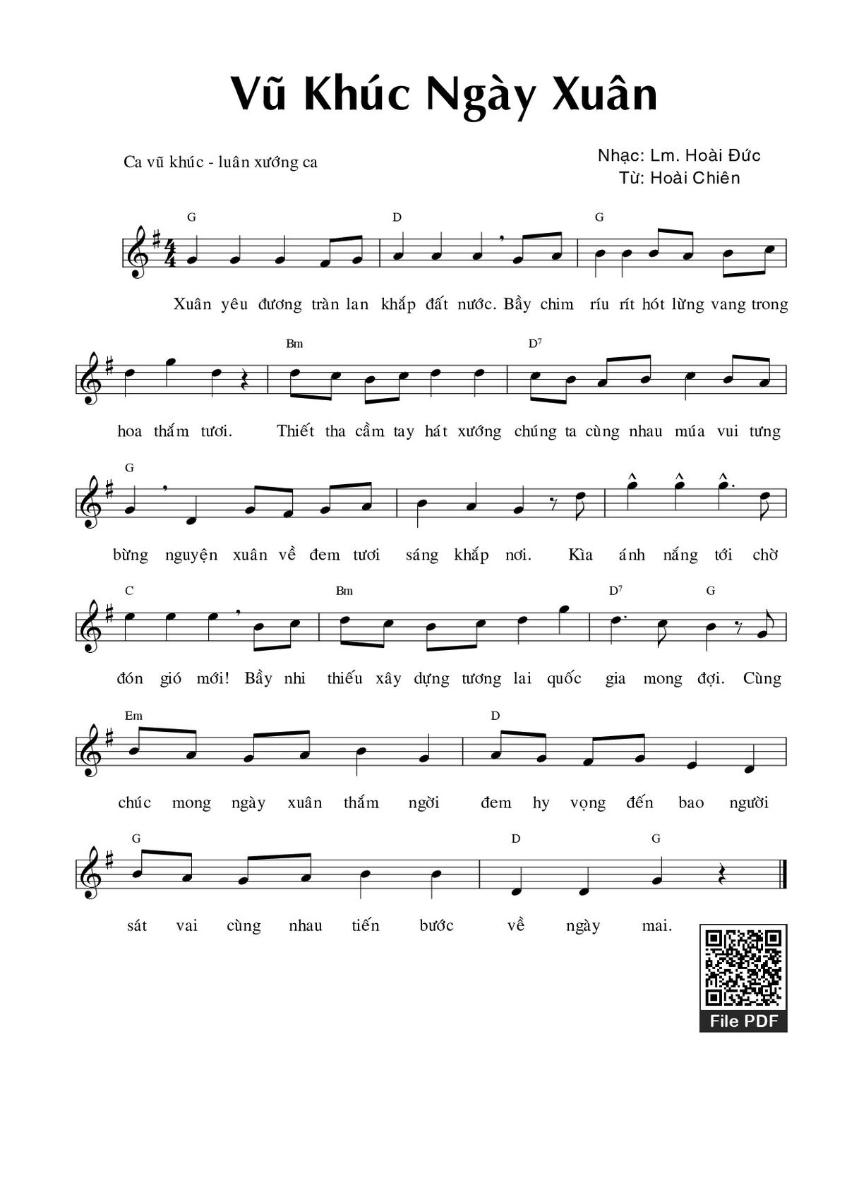 Sheet music Vũ khúc ngày xuân by Hoài Đức and PDF file was posted here to support you to practice singing perfectly. Sheets with notes and chords are for reference only, for non-commercial purposes only, not involved with earning money by buying and selling. Copyright is belong to song writer/author and copyright owner. Truongca.com do not own any copyrighted content. You can download the high-quality PDF files which contain staffs by PDF link above.