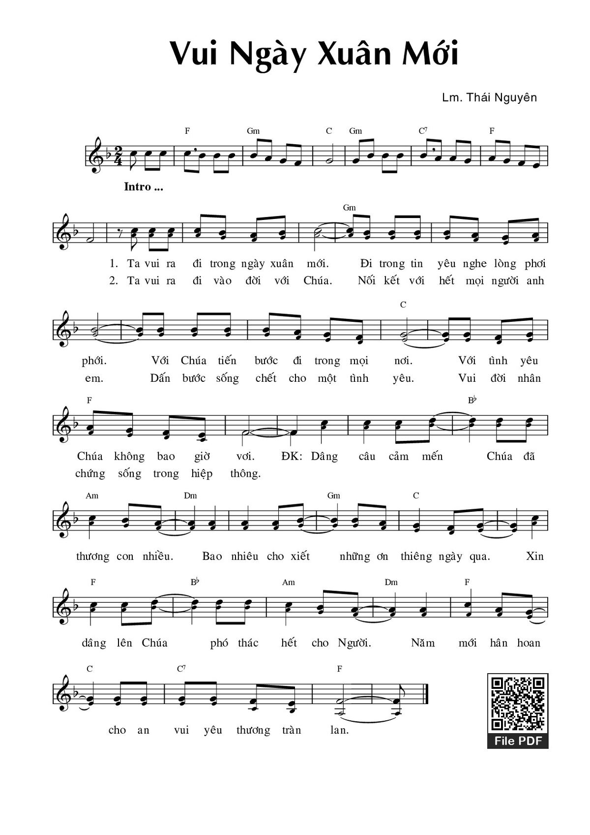 Sheet music Vui ngày xuân mới by Thái Nguyên and PDF file was posted here to support you to practice singing perfectly. Sheets with notes and chords are for reference only, for non-commercial purposes only, not involved with earning money by buying and selling. Copyright is belong to song writer/author and copyright owner. Truongca.com do not own any copyrighted content. You can download the high-quality PDF files which contain staffs by PDF link above.