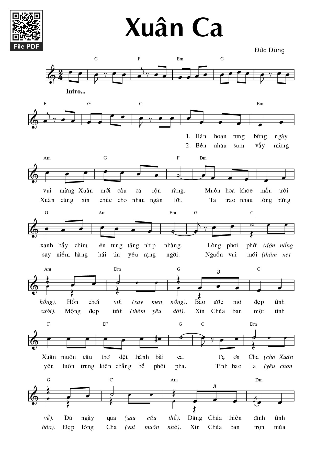 Sheet music Xuân ca by Đức Dũng and PDF file was posted here to support you to practice singing perfectly. Sheets with notes and chords are for reference only, for non-commercial purposes only, not involved with earning money by buying and selling. Copyright is belong to song writer/author and copyright owner. Truongca.com do not own any copyrighted content. You can download the high-quality PDF files which contain staffs by PDF link above.
