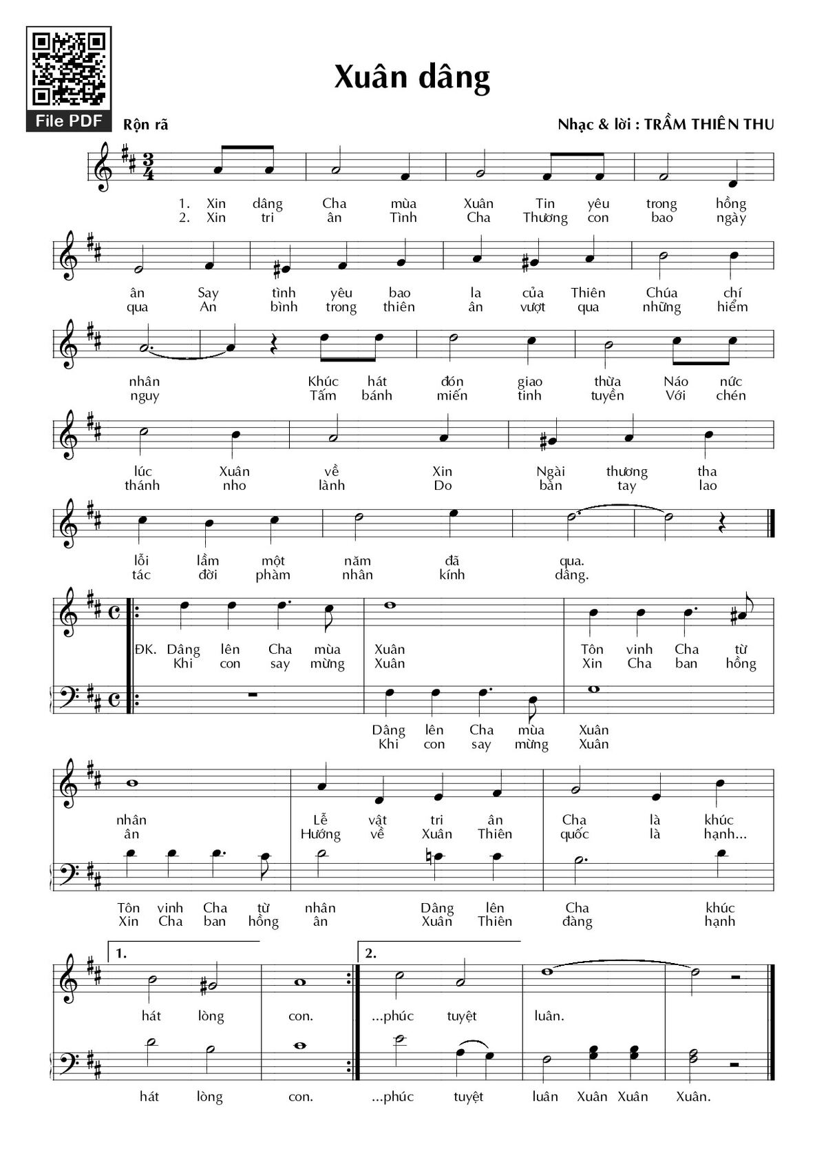 Sheet music Xuân dâng by Trầm Thiên Thu and PDF file was posted here to support you to practice singing perfectly. Sheets with notes and chords are for reference only, for non-commercial purposes only, not involved with earning money by buying and selling. Copyright is belong to song writer/author and copyright owner. Truongca.com do not own any copyrighted content. You can download the high-quality PDF files which contain staffs by PDF link above.