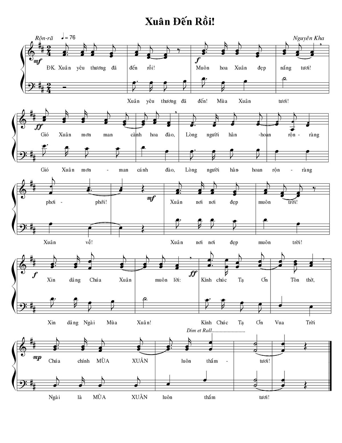 Sheet music Xuân đến rồi by Nguyên Kha and PDF file was posted here to support you to practice singing perfectly. Sheets with notes and chords are for reference only, for non-commercial purposes only, not involved with earning money by buying and selling. Copyright is belong to song writer/author and copyright owner. Truongca.com do not own any copyrighted content. You can download the high-quality PDF files which contain staffs by PDF link above.
