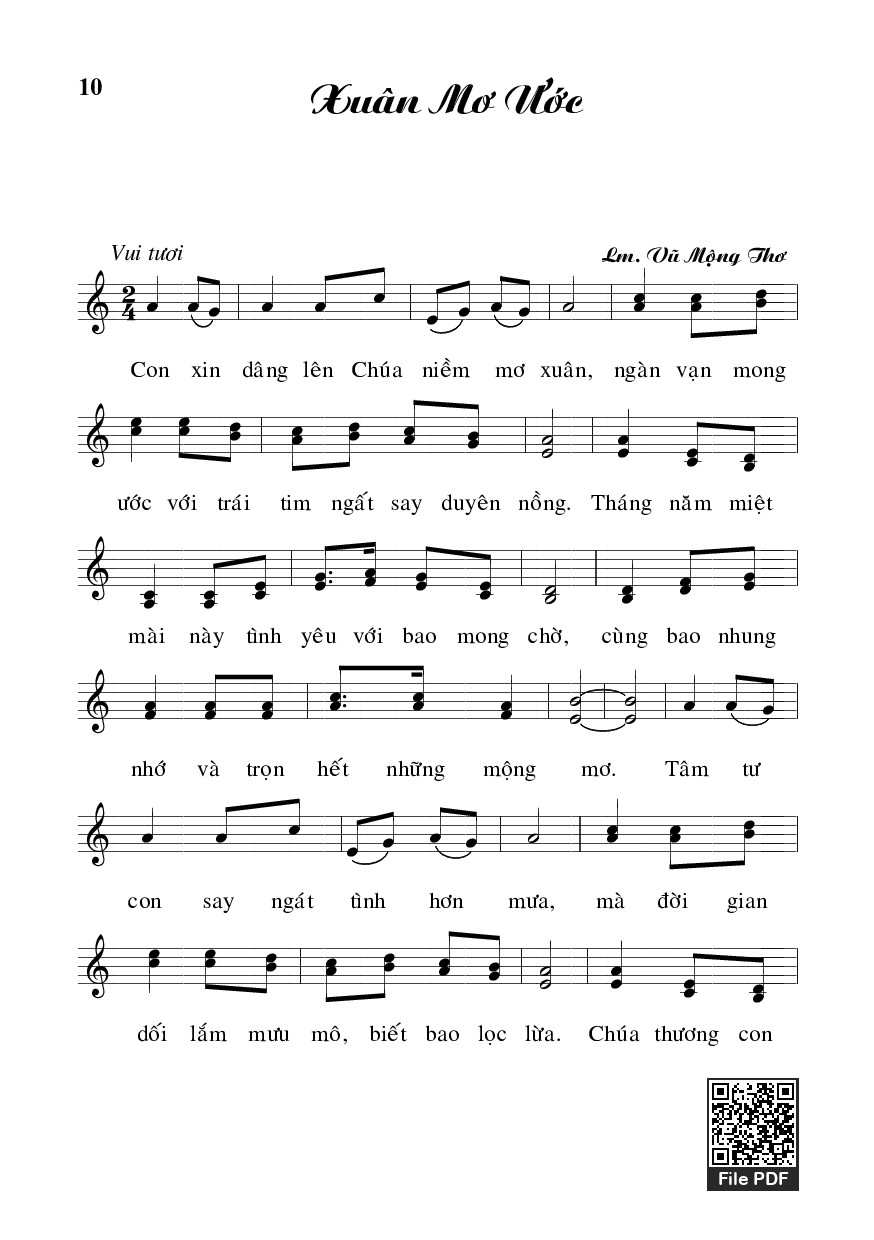 Sheet music Xuân mơ ước by Vũ Mộng Thơ and PDF file was posted here to support you to practice singing perfectly. Sheets with notes and chords are for reference only, for non-commercial purposes only, not involved with earning money by buying and selling. Copyright is belong to song writer/author and copyright owner. Truongca.com do not own any copyrighted content. You can download the high-quality PDF files which contain staffs by PDF link above.