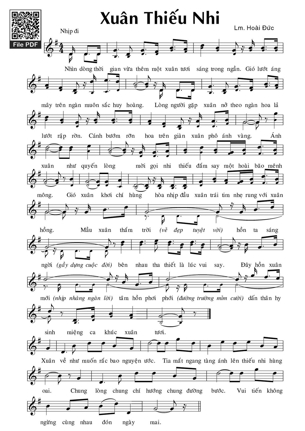 Sheet music Xuân thiếu nhi by Hoài Đức and PDF file was posted here to support you to practice singing perfectly. Sheets with notes and chords are for reference only, for non-commercial purposes only, not involved with earning money by buying and selling. Copyright is belong to song writer/author and copyright owner. Truongca.com do not own any copyrighted content. You can download the high-quality PDF files which contain staffs by PDF link above.