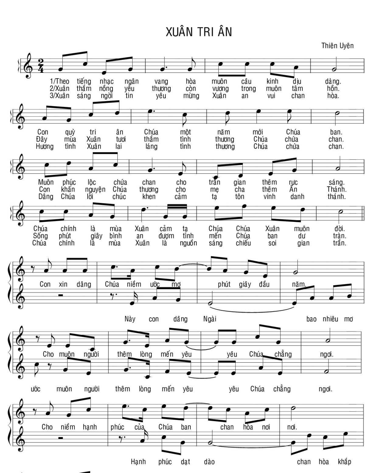 Sheet music Xuân tri ân by Thiên Uyên and PDF file was posted here to support you to practice singing perfectly. Sheets with notes and chords are for reference only, for non-commercial purposes only, not involved with earning money by buying and selling. Copyright is belong to song writer/author and copyright owner. Truongca.com do not own any copyrighted content. You can download the high-quality PDF files which contain staffs by PDF link above.