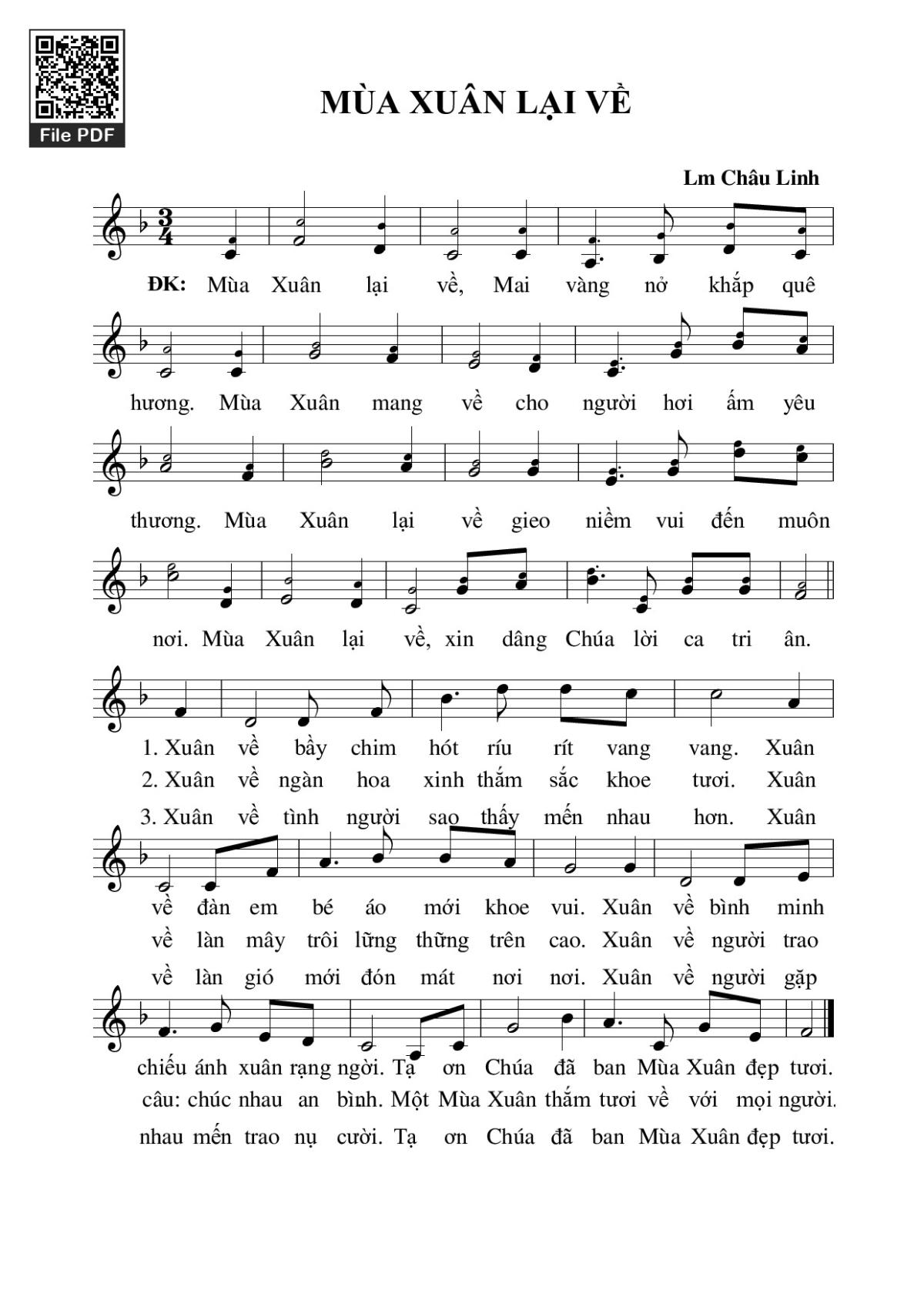 Điệp khúc. Mùa Xuân lại về, Mai vàng nở khắp quê hương. Mùa Xuân mang về cho người hơi ấm yêu thương. Mùa Xuân lại về gieo niềm vui đến muôn nơi. Mùa Xuân lại về, xin dâng Chúa lời ca tri ân.
