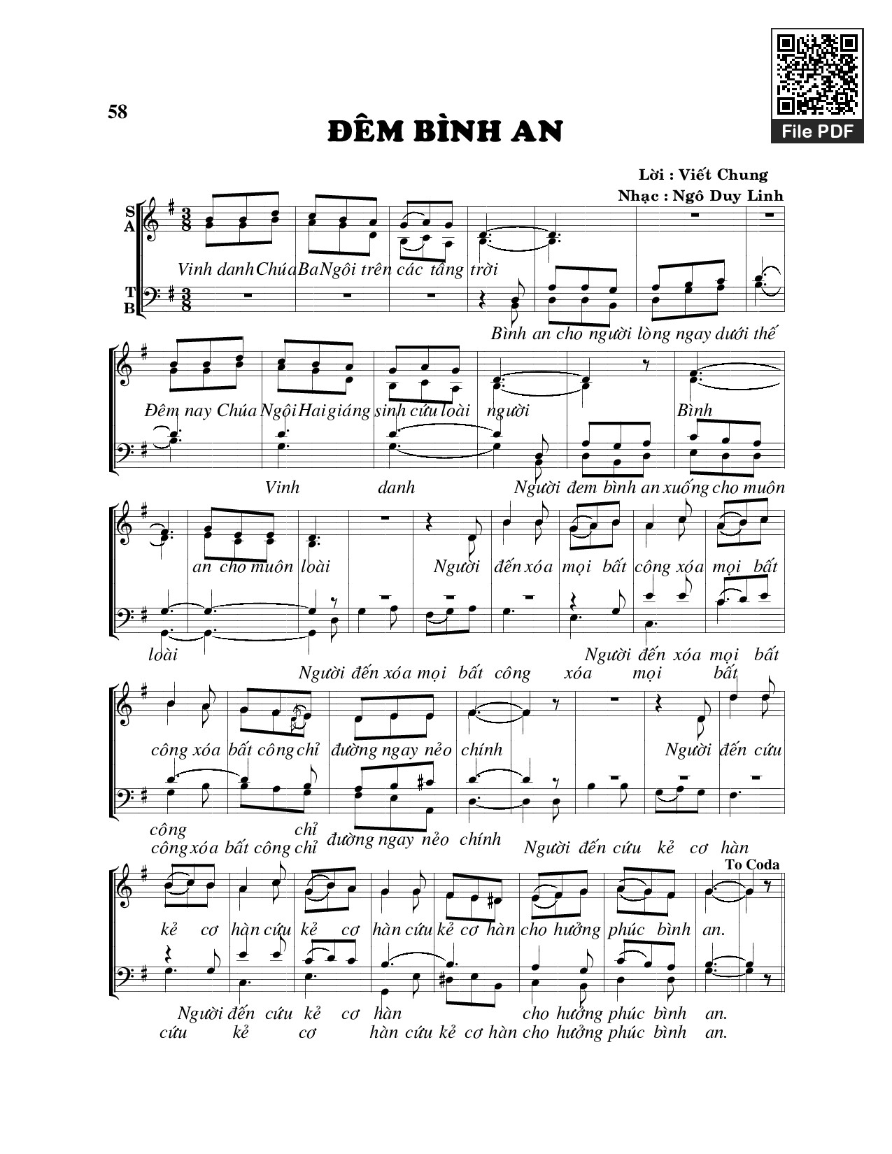 Điệp khúc. Vinh danh Chúa Ba Ngôi trên các tầng trời. Bình an cho người lòng ngay dưới thế. Đêm nay Chúa Ngôi Hai giáng sinh cứu loài người. Người đem bình an xuống cho muôn người. Người đến xóa mọi bất công, xóa mọi bất công, xóa bất công chỉ đường ngay nẻo chính. Người đến cứu kẻ cơ hàn, cứu kẻ cơ hàn, cứu kể cơ hàn cho hưởng phúc bình an.