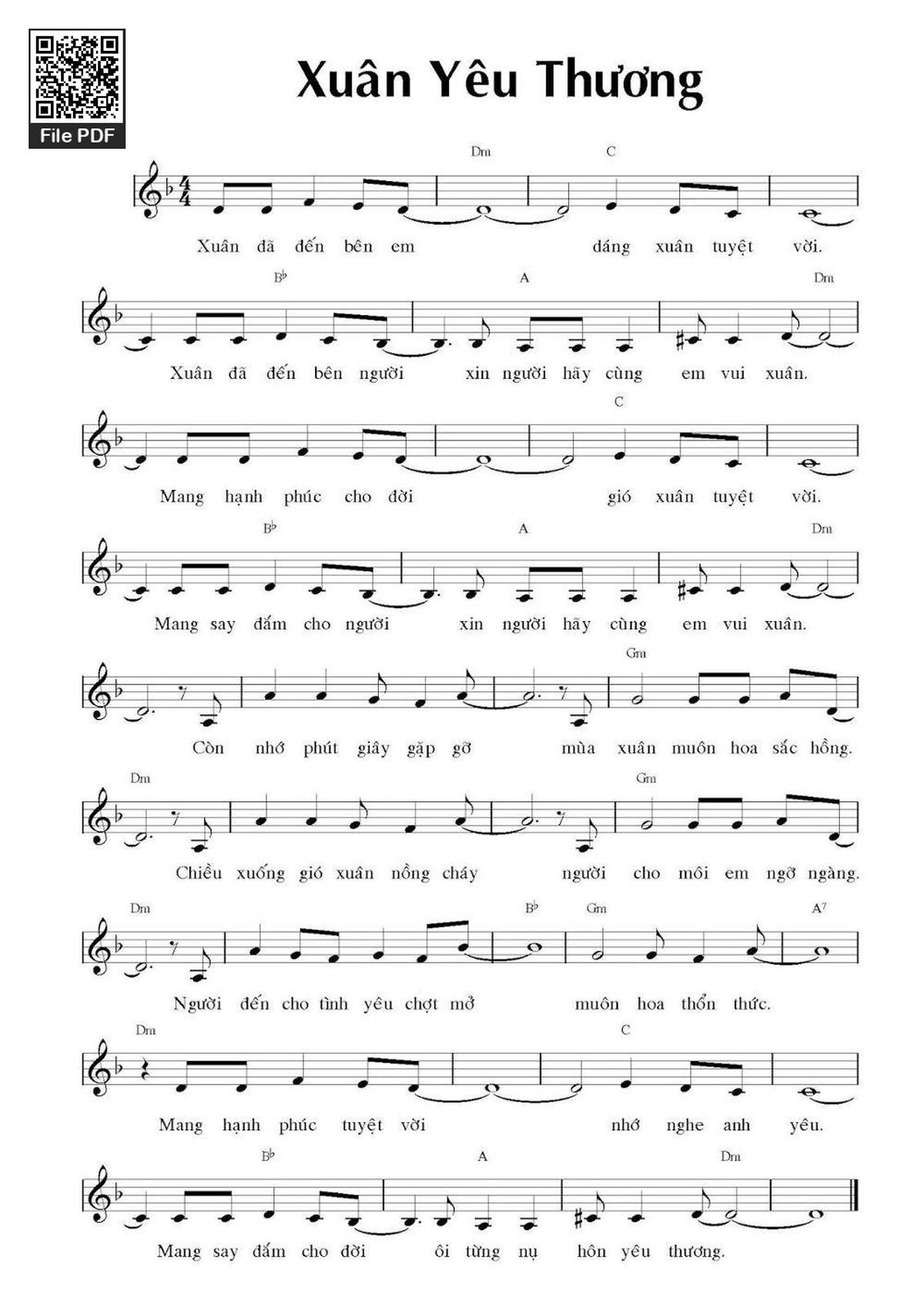 Sheet music Xuân Yêu Thương by Nhạc Ngoại and PDF file was posted here to support you to practice singing perfectly. Sheets with notes and chords are for reference only, for non-commercial purposes only, not involved with earning money by buying and selling. Copyright is belong to song writer/author and copyright owner. Truongca.com do not own any copyrighted content. You can download the high-quality PDF files which contain staffs by PDF link above.