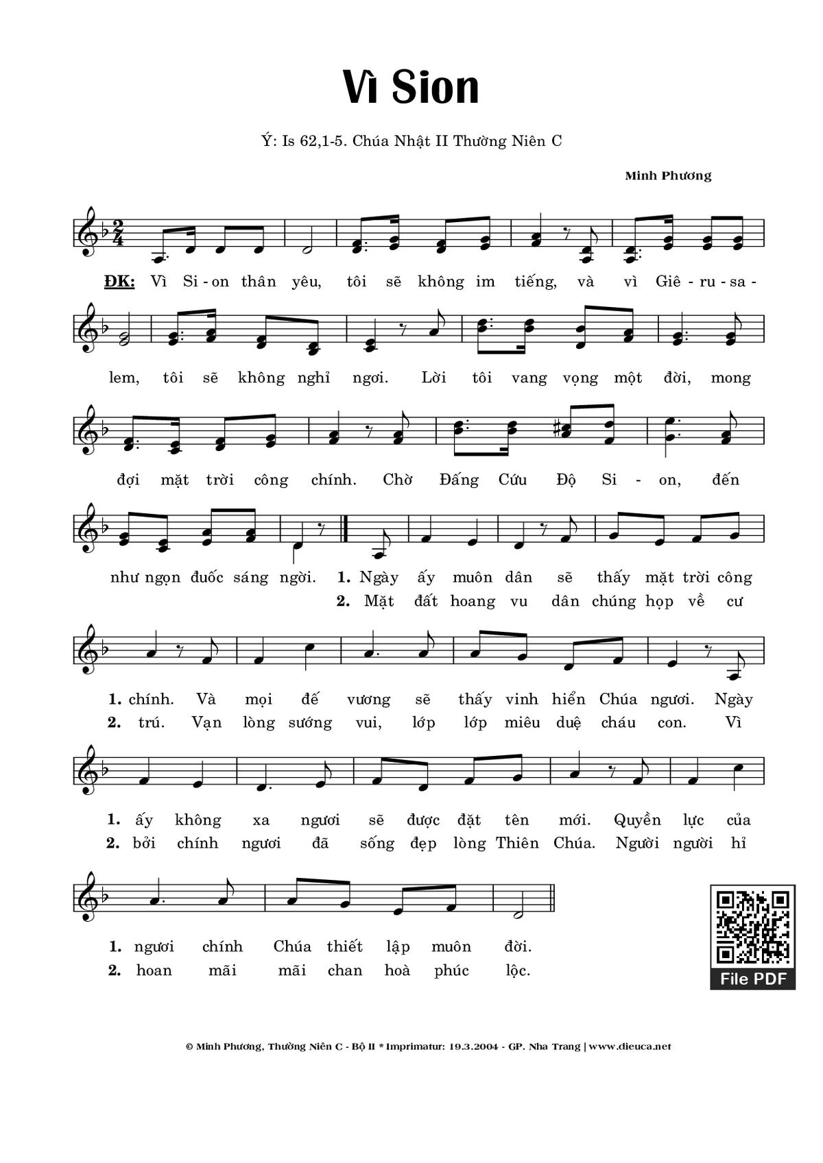 Điệp khúc: Vì Si-on thân yêu, tôi sẽ không im tiếng, và vì Giê-ru-sa-lem, tôi sẽ không nghỉ ngơi. Lời tôi vang vọng một đời, mong đợi mặt trời công chính. Chờ Đấng Cứu Độ Si-on, đến như ngọn đuốc sáng ngời.