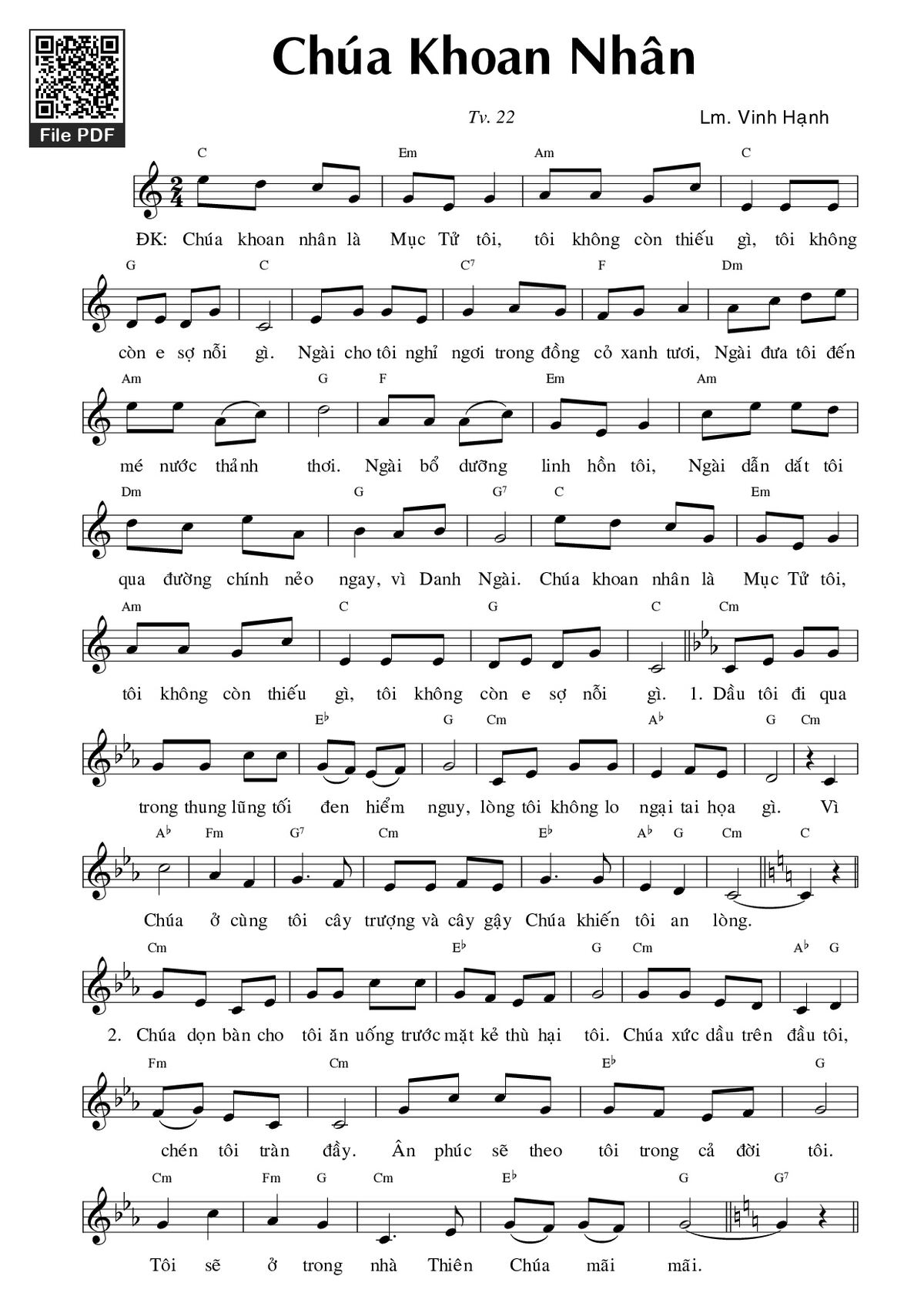 Điệp khúc: Chúa khoan nhân là Mục Tử tôi, tôi không còn thiếu gì, tôi không còn e sợ nỗi gì. Ngài cho tôi nghỉ ngơi trong đồng cỏ xanh tươi, Ngài đưa tôi đến mé nước thảnh thơi. Ngài bổ dưỡng linh hồn tôi, Ngài dẫn dắt tôi qua đường chính nẻo ngay, vì Danh Ngài. Chúa khoan nhân là Mục Tử tôi, tôi không còn thiếu gì, tôi không còn e sợ nỗi gì.