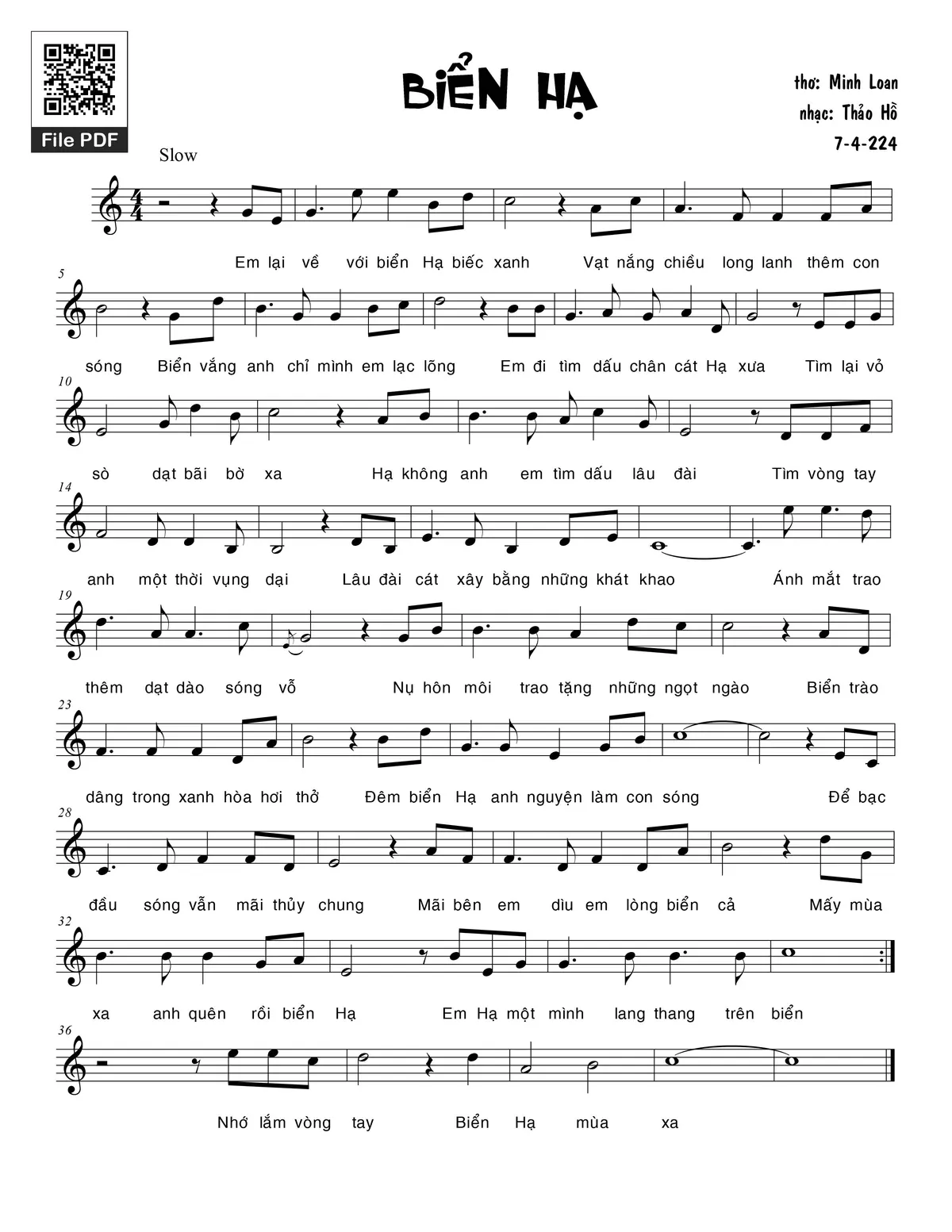 Thảo Hồ Em lại về với biển Hạ biếc xanh Vạt nắng chiều long lanh thêm con sóng [PDF] [Sheet] [Lyrics] [Mp4/Midi]