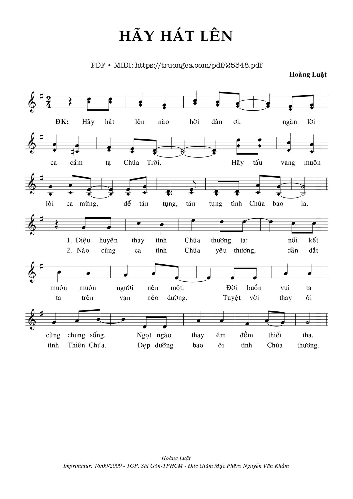 The first sentence: Hãy hát lên nào hỡi dân ơi ngàn lời ca cảm tạ Chúa Trời