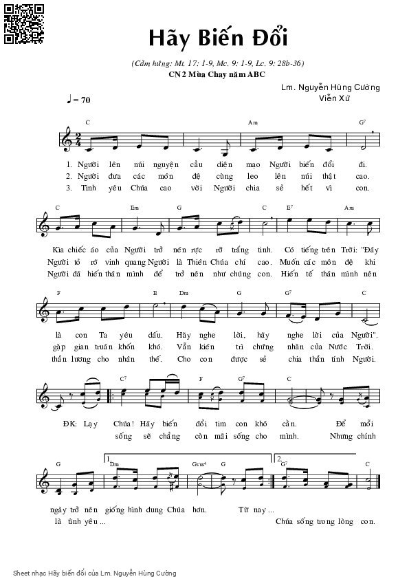 The Videos/audios Hãy biến đổi by Lm. Nguyễn Hùng Cường were embed from Youtube, Musescore or the other 3rd links. Videos are subject to 3rd's copyright control and may be removed by YouTube's copyright rules and 3rd's policies or maybe included advertisements. If you cannot access to these songs, this mean that have been removed.