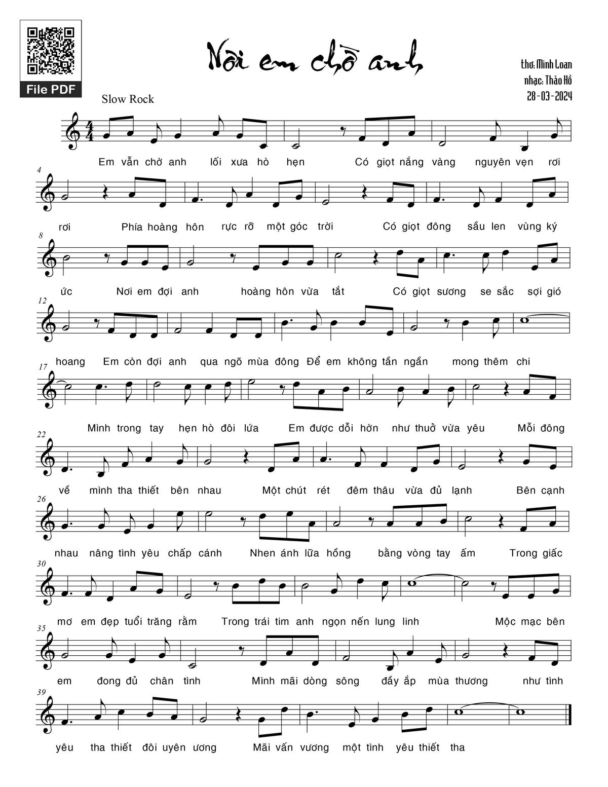 Thảo Hồ Em vẫn chờ anh lối xưa hò hẹn Có giọt nắng vàng nguyên vẹn rơi rơi [PDF] [Sheet] [Lyrics] [Mp4/Midi]