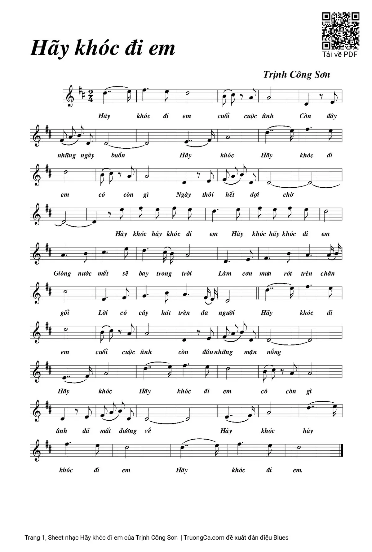 The Videos/audios Hãy khóc đi em by Trịnh Công Sơn were embed from Youtube, Musescore or the other 3rd links. Videos are subject to 3rd's copyright control and may be removed by YouTube's copyright rules and 3rd's policies or maybe included advertisements. If you cannot access to these songs, this mean that have been removed.