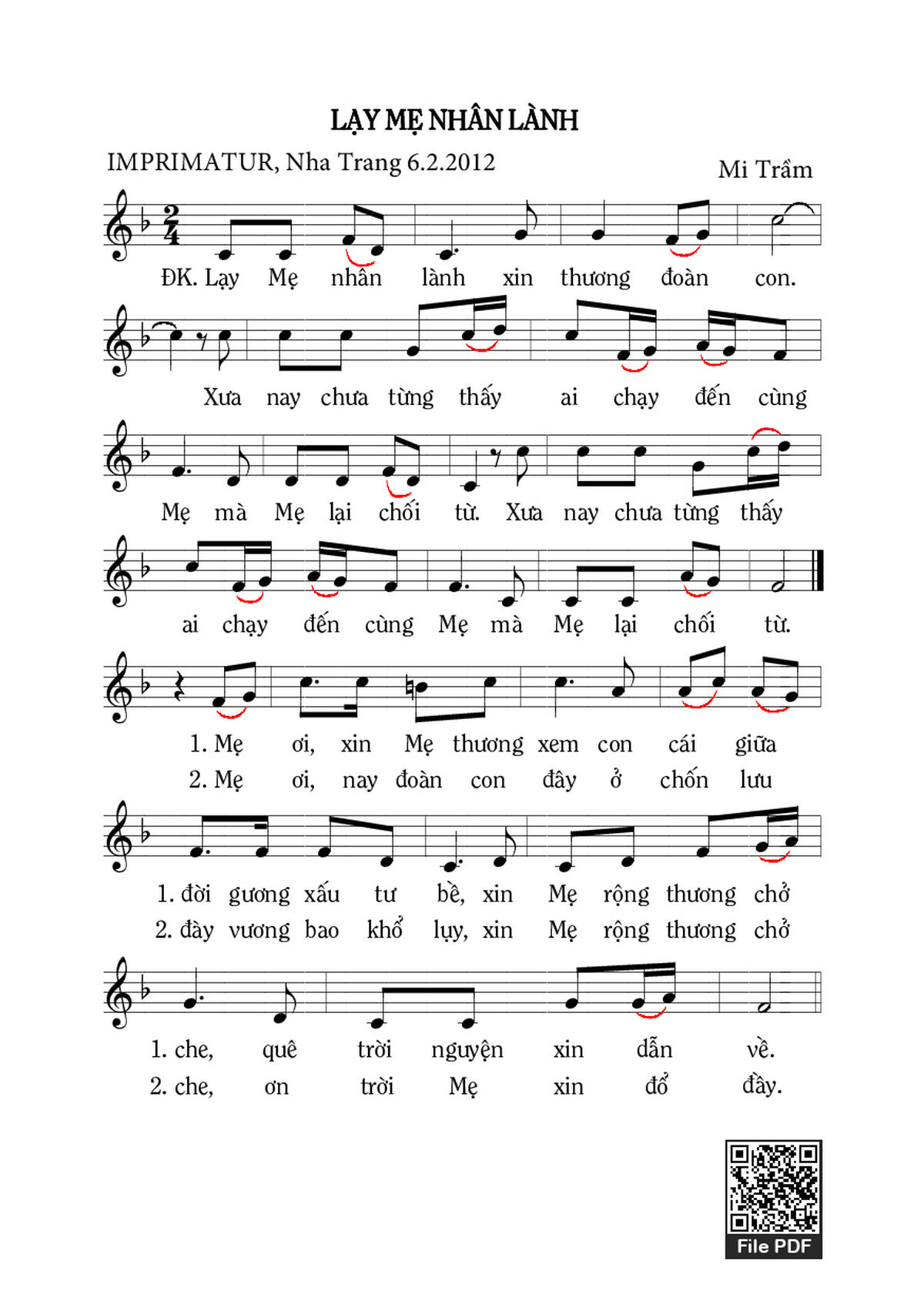 Mi Trầm Lạy Mẹ nhân lành xin thương đoàn con Xưa nay chưa từng thấy ai chạy đến cùng Mẹ mà Mẹ lại chối từ [PDF] [Sheet] [Lyrics] [Mp4/Midi]