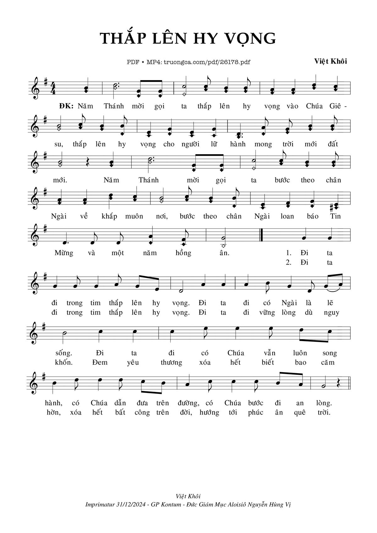 Điệp khúc. Năm Thánh mời gọi ta thắp lên hy vọng vào Chúa Giêsu, thắp lên hy vọng cho người lữ hành, mong trời mới đất mới. Năm Thánh mời gọi ta bước theo chân Ngài về khắp muôn nơi, bước theo chân Ngài loan báo Tin Mừng và một năm hồng ân.