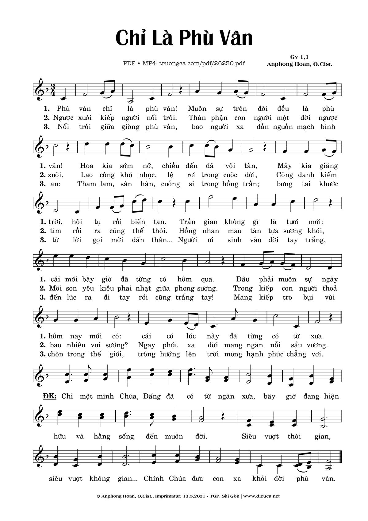 1. Phù vân chỉ là phù vân! Muôn sự trên đời đều là phù vân! Hoa kia sớm nở, chiều đến đã vội tàn, Mây kia giăng trời, hội tụ rồi biến tan. Trần gian không gì là tươi mới: cái mới bây giờ đã từng có hôm qua. Đâu phải muôn sự ngày hôm nay mới có: cái có lúc này đã từng có từ xưa.