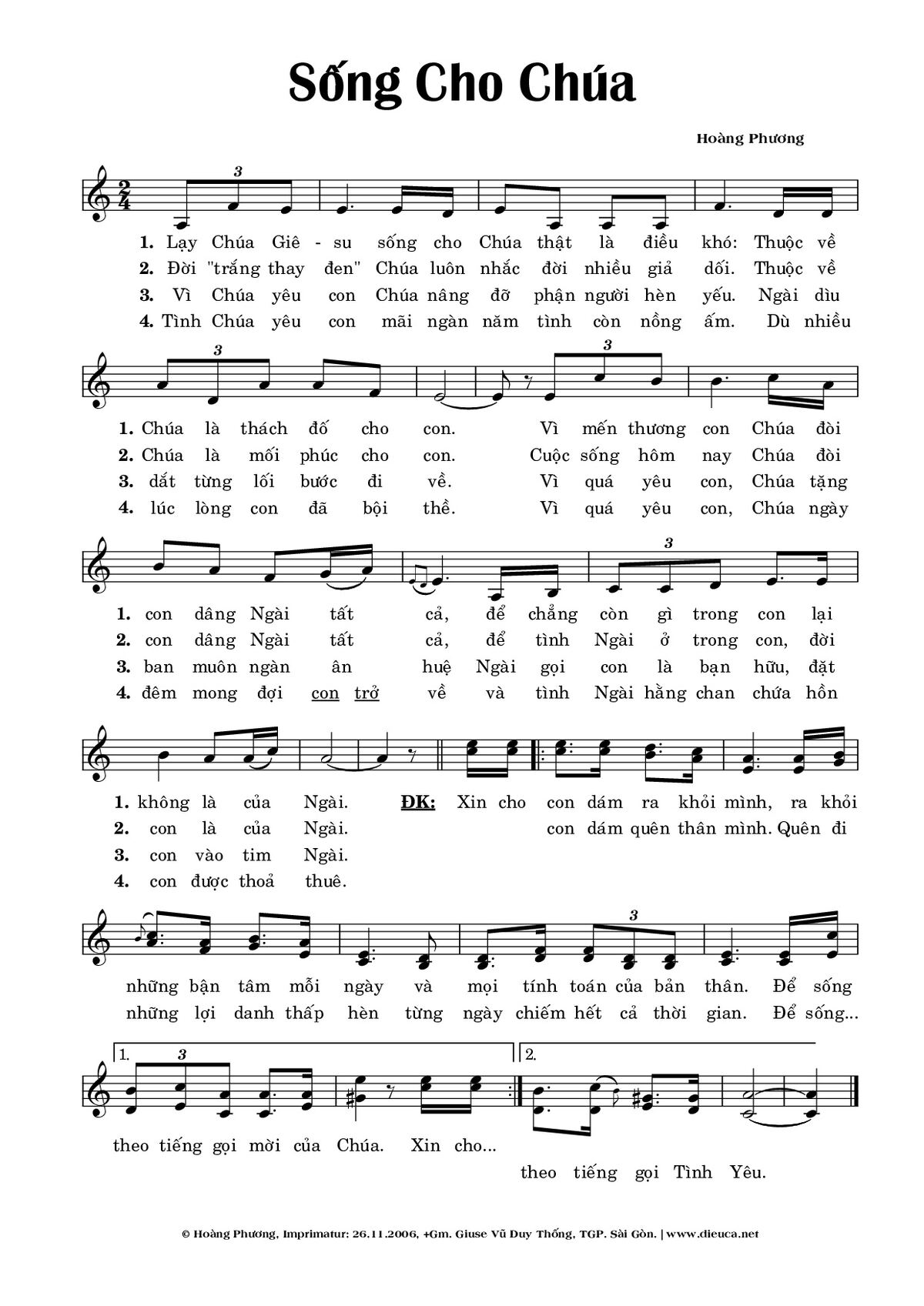 Transposition is the process of moving a song's melody and chords up or down in pitch by a constant interval. The direction of the transposition tool is indicated by a plus (+) sign for up and a minus (-) sign for down. Hover mouse over chords signs to see the chords chart of Sống Cho Chúa song.