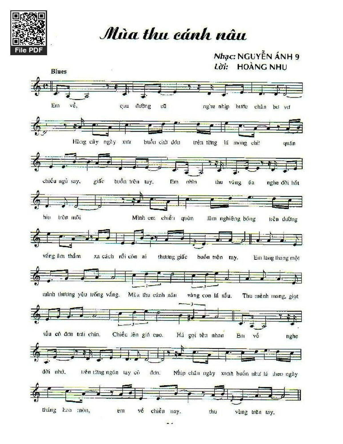 Sheet music Mùa Thu Cánh Nâu by Hoàng Nhu and PDF file was posted here to support you to practice singing perfectly. Sheets with notes and chords are for reference only, for non-commercial purposes only, not involved with earning money by buying and selling. Copyright is belong to song writer/author and copyright owner. Truongca.com do not own any copyrighted content. You can download the high-quality PDF files which contain staffs by PDF link above.