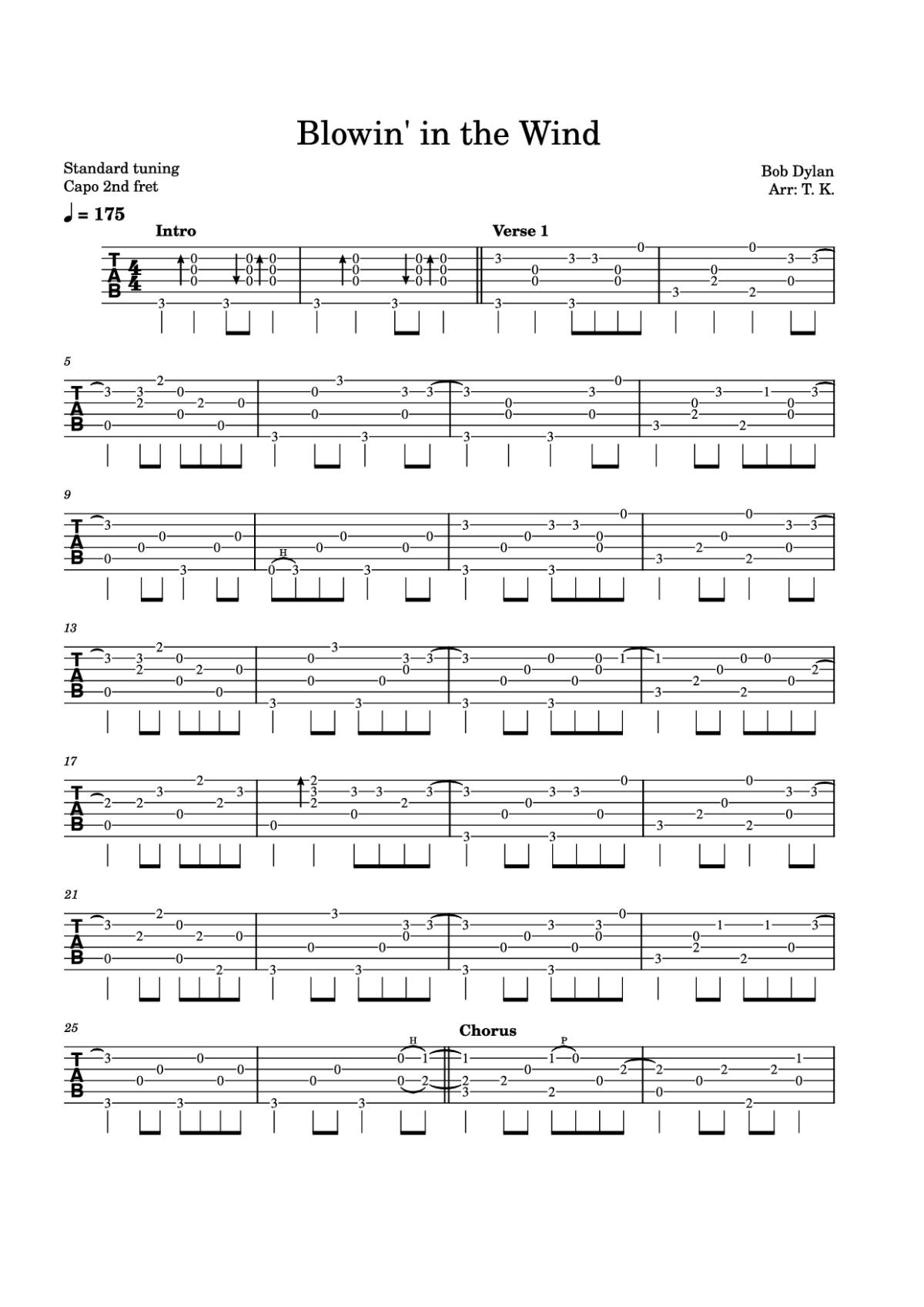 The Videos/audios Blowin' in the Wind Guitar TAB by Bob Dylan were embed from Youtube, Musescore or the other 3rd links. Videos are subject to 3rd's copyright control and may be removed by YouTube's copyright rules and 3rd's policies or maybe included advertisements. If you cannot access to these videos/audios, this mean that have been removed.