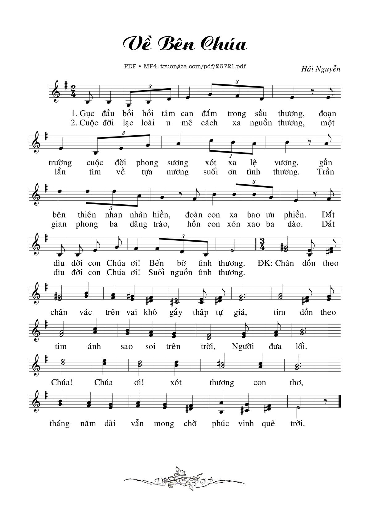 Transposition is the process of moving a song's melody and chords up or down in pitch by a constant interval. The direction of the transposition tool is indicated by a plus (+) sign for up and a minus (-) sign for down. Hover mouse over chords signs to see the chords chart of Về Bên Chúa song.