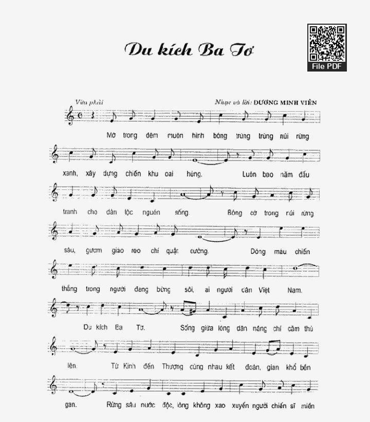 Sheet music Du Kích Ba Tơ by Dương Minh Viên and PDF file was posted here to support you to practice singing perfectly. Sheets with notes and chords are for reference only, for non-commercial purposes only, not involved with earning money by buying and selling. Copyright is belong to song writer/author and copyright owner. Truongca.com do not own any copyrighted content. You can download the high-quality PDF files which contain staffs by PDF link above.