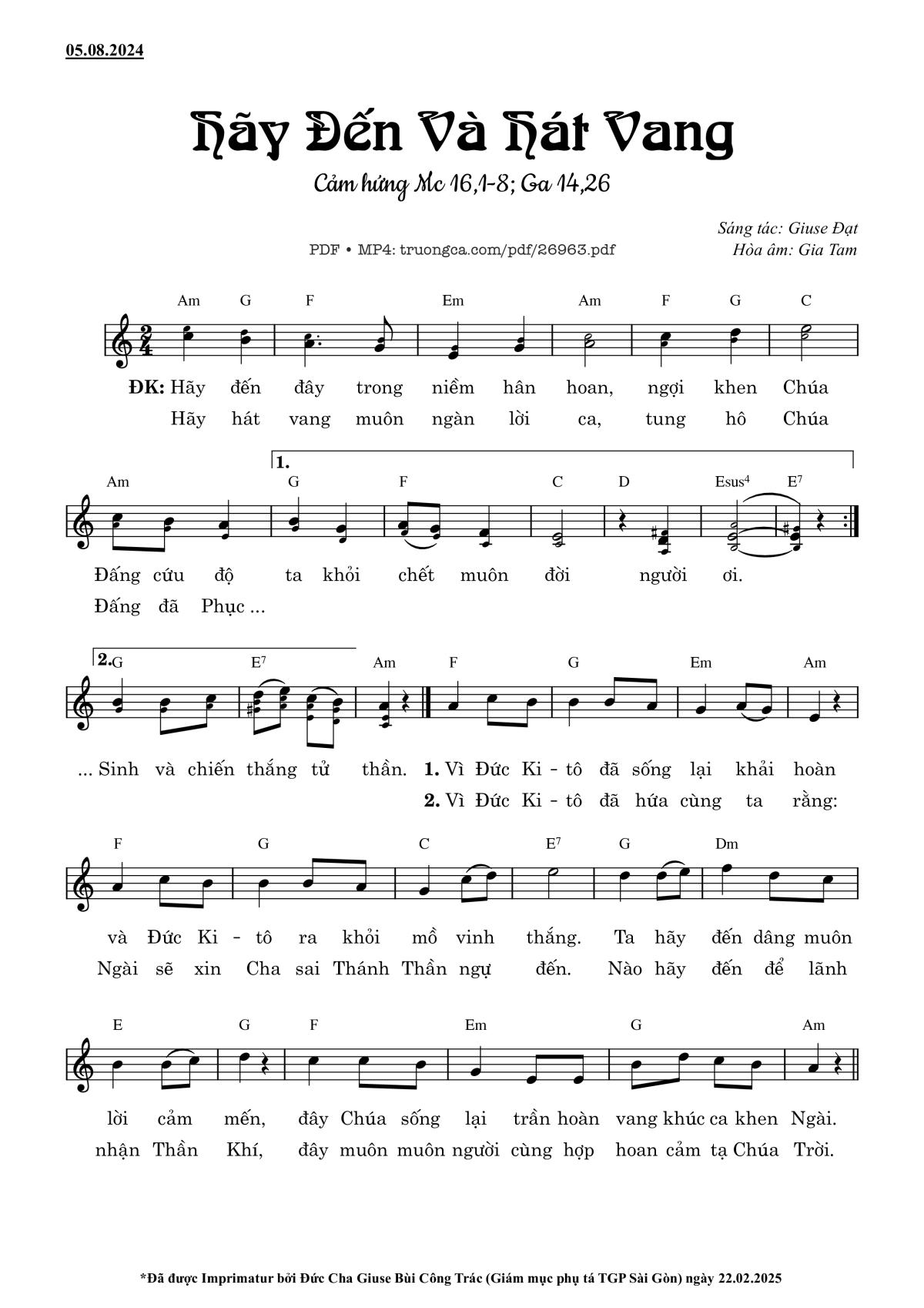 Điệp khúc. -Hay đến đây trong niềm hân hoan, ngợi khen Chúa Đấng cứu độ ta khỏi chết muôn đời người ơi. Hãy hát vang muôn ngàn lời ca,tung hô Chúa Đấng đã Phục Sinh và chiến thắng tử thần.