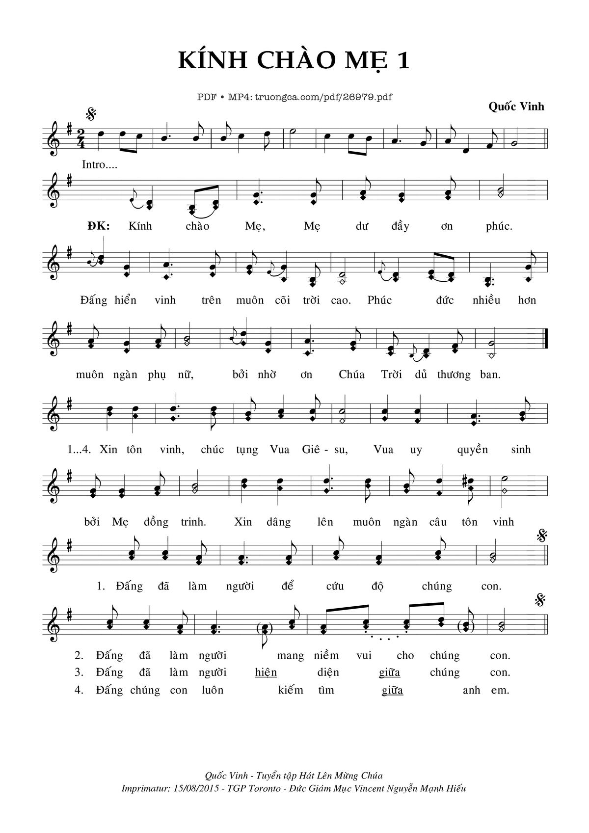 Điệp khúc. Kính chào Mẹ, Mẹ dư đầy ơn phúc. Đấng hiển vinh trên muôn cõi trời cao. Phúc đức nhiều hơn muôn ngàn phụ nữ bởi nhờ ơn Chúa Trời dủ thương ban.
