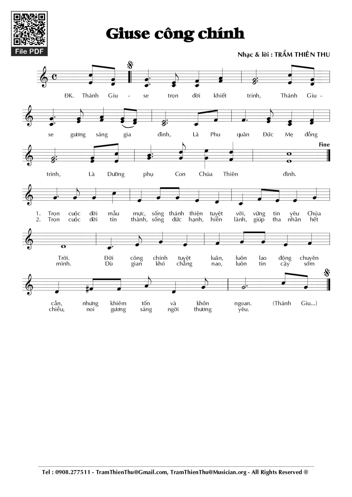 Điệp khúc. Thánh Giuse trọn đời khiết trinh. Thánh Giuse gương sáng gia đình. Là phu quân Đức Mẹ đồng trinh. Là dưỡng phụ Con Thiên Chúa thiên đình.
