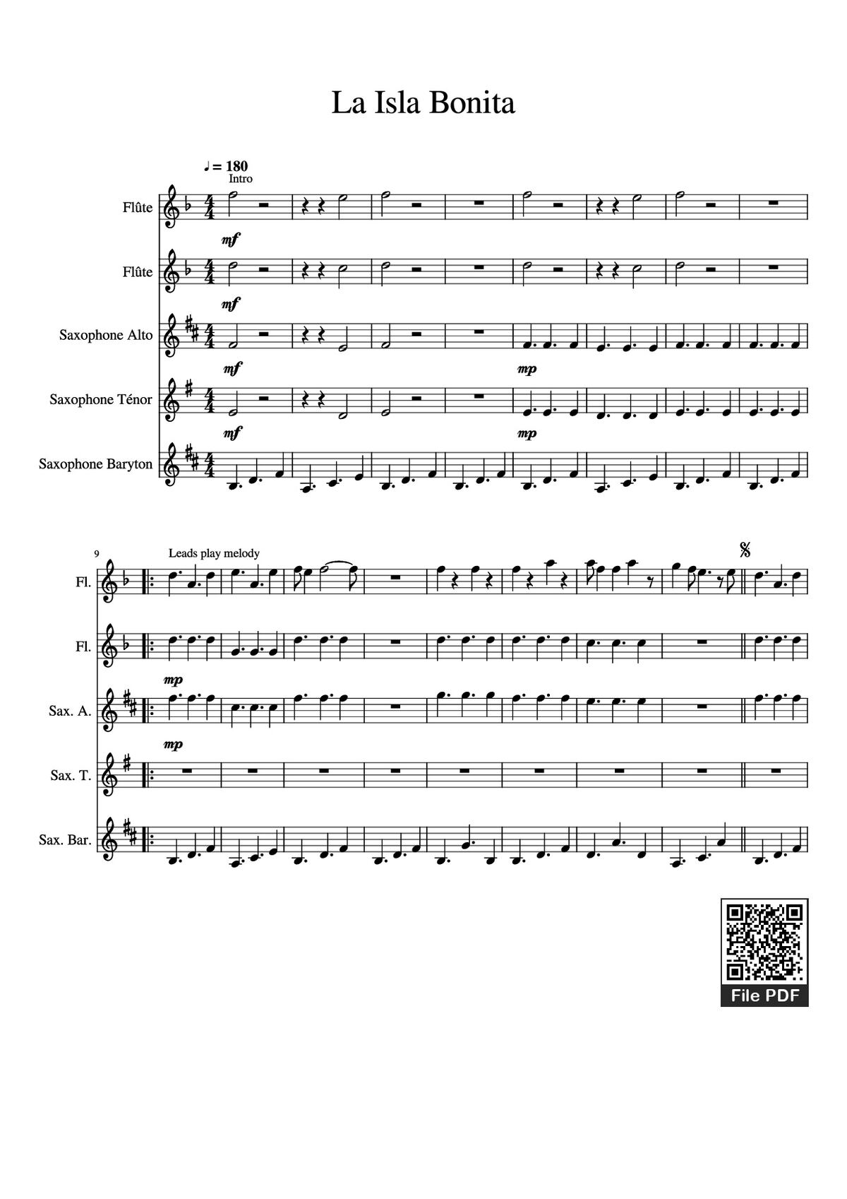 Download and print in PDF or MIDI free sheet music of la isla bonita - Madonna for La Isla Bonita by Madonna arranged by rafffyyy1 for Flute, Saxophone alto, Saxophone tenor, Saxophone baritone (Mixed Quintet)
