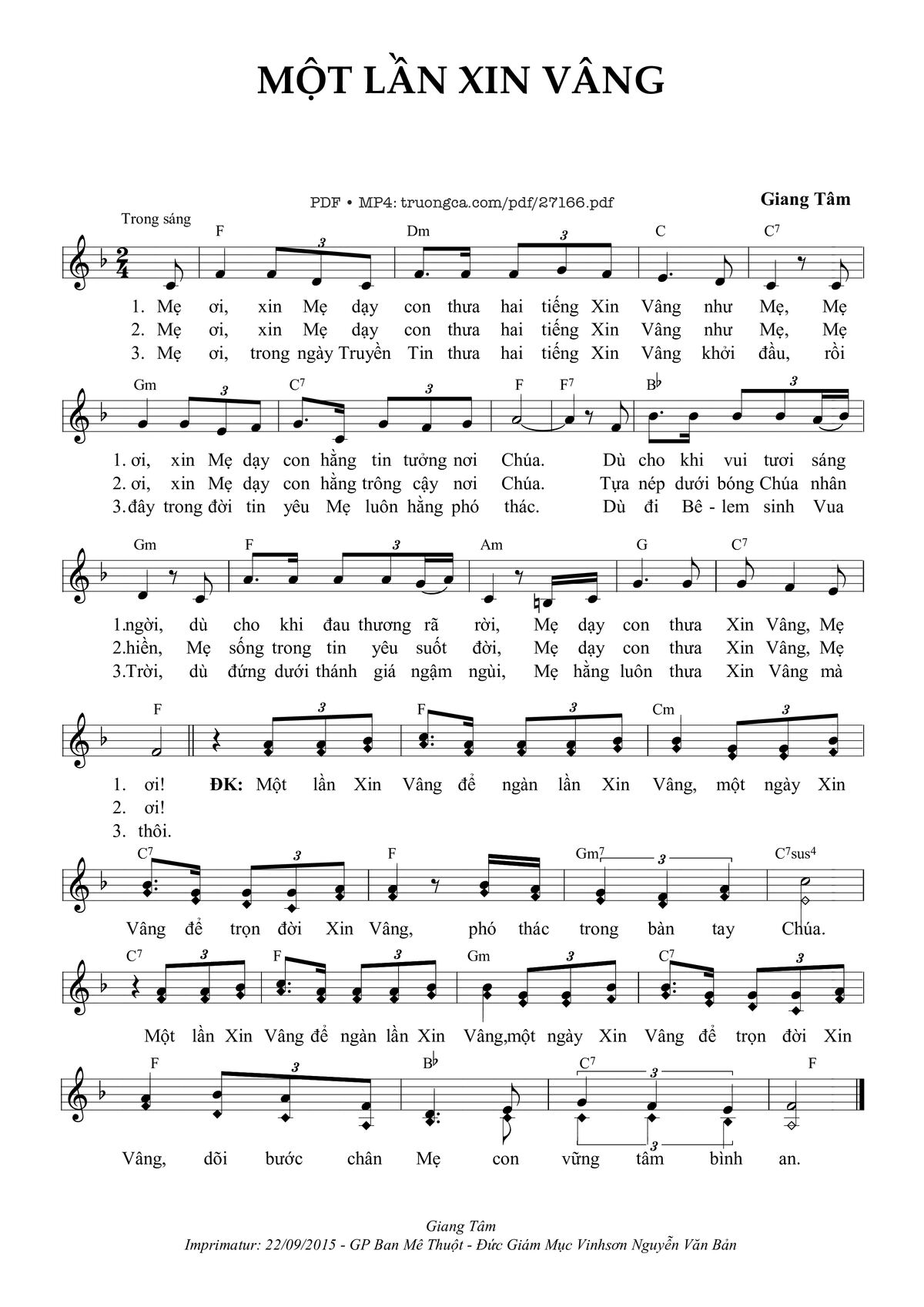 Giang Tâm Mẹ ơi xin Mẹ dạy con thưa hai tiếng Xin Vâng như Mẹ [PDF] [Sheet] [Lyrics] [Mp4/Midi]