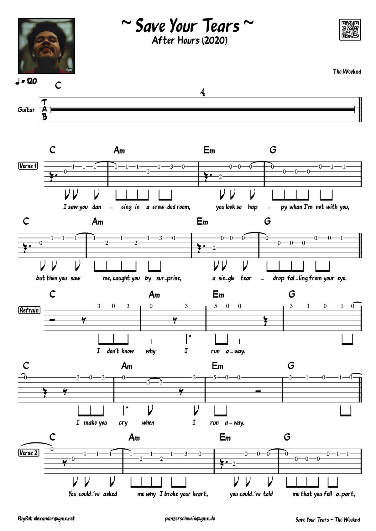 The Videos/audios ~ Save Your Tears ~ Guitar TAB by The Weeknd were embed from Youtube, Musescore or the other 3rd links. Videos are subject to 3rd's copyright control and may be removed by YouTube's copyright rules and 3rd's policies or maybe included advertisements. If you cannot access to these videos/audios, this mean that have been removed.
