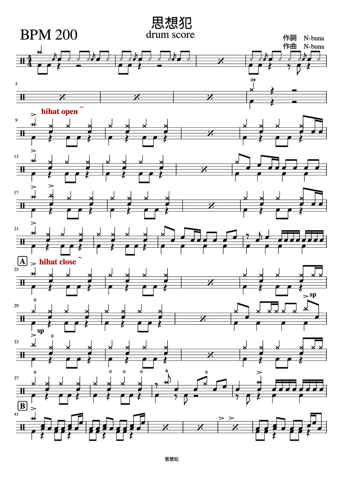 Download and print in PDF or MIDI free sheet music of 思想犯 - pandaaaaaaaaaaaaaaaa for 思想犯 arranged by pandaaaaaaaaaaaaaaaa for Drum group (Solo)