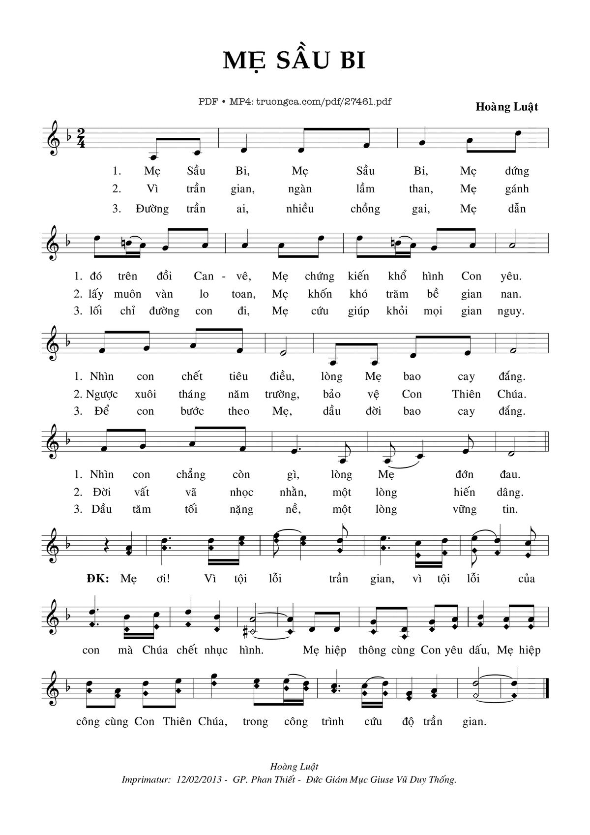1) Mẹ Sầu Bi, Mẹ Sầu Bi, Mẹ đứng đó trên đồi Canvê, Mẹ chứng kiến khổ hình Con yêu. Nhìn Con chết tiêu điều, lòng Mẹ bao cay đắng. Nhìn Con chẳng còn gì, lòng Mẹ đớn đau.
