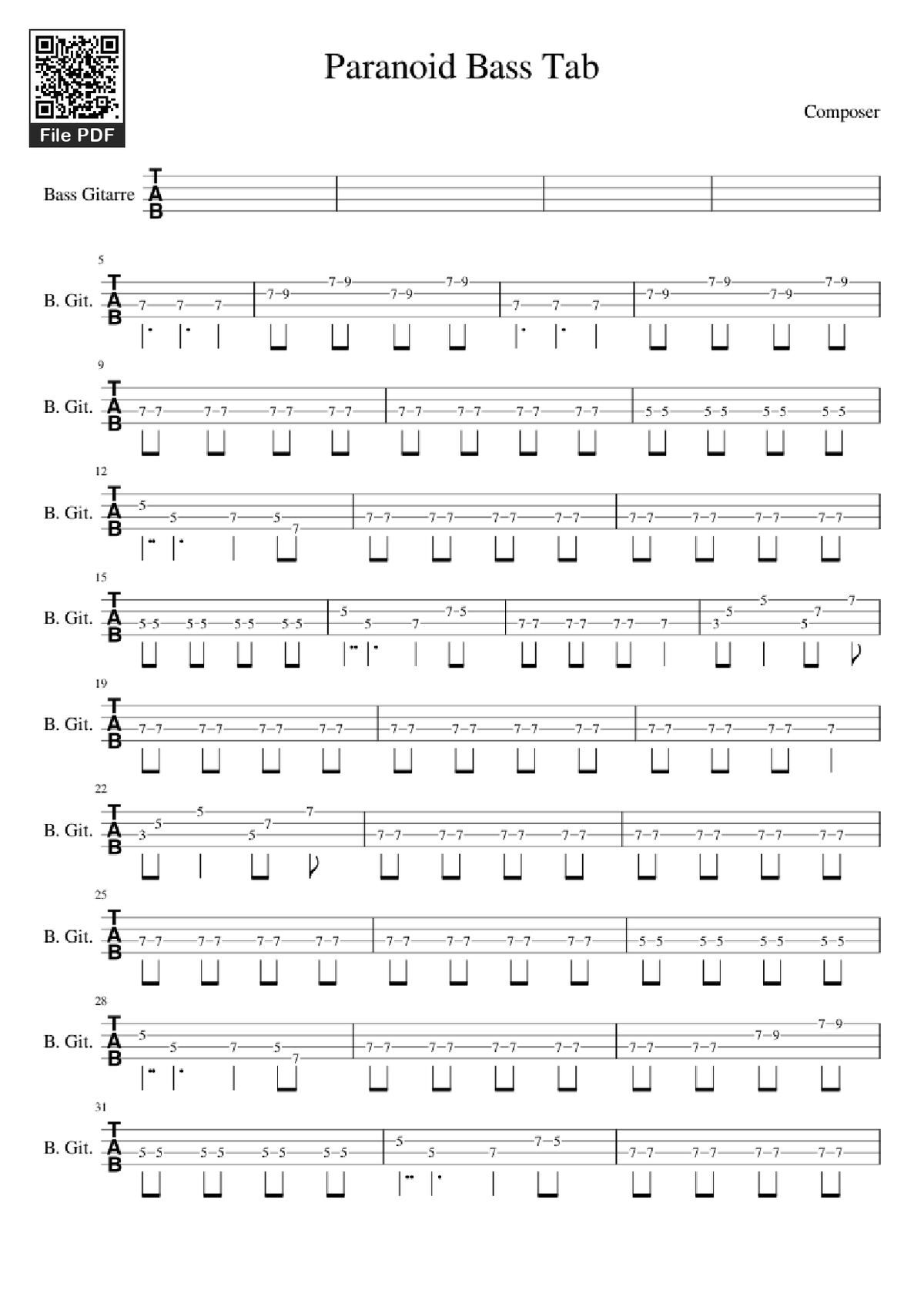 The Videos/audios Paranoid Bass Tab Guitar TAB by Composer were embed from Youtube, Musescore or the other 3rd links. Videos are subject to 3rd's copyright control and may be removed by YouTube's copyright rules and 3rd's policies or maybe included advertisements. If you cannot access to these videos/audios, this mean that have been removed.