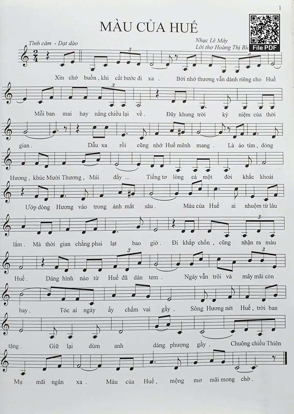 Lê Máy Xin chớ buồn khi cất bước đi xa Bởi nhớ thương vẫn dành riêng cho Huế [PDF] [Sheet] [Lyrics] [Mp4/Midi]