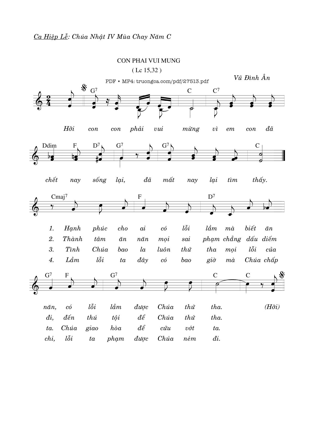 Vũ Đình Ân Hiệp Lễ Chúa Nhật C Mùa Chay Hỡi con con phải vui mừng vì em con đã chết nay sống lại [PDF] [Sheet] [Lyrics] [Mp4/Midi]
