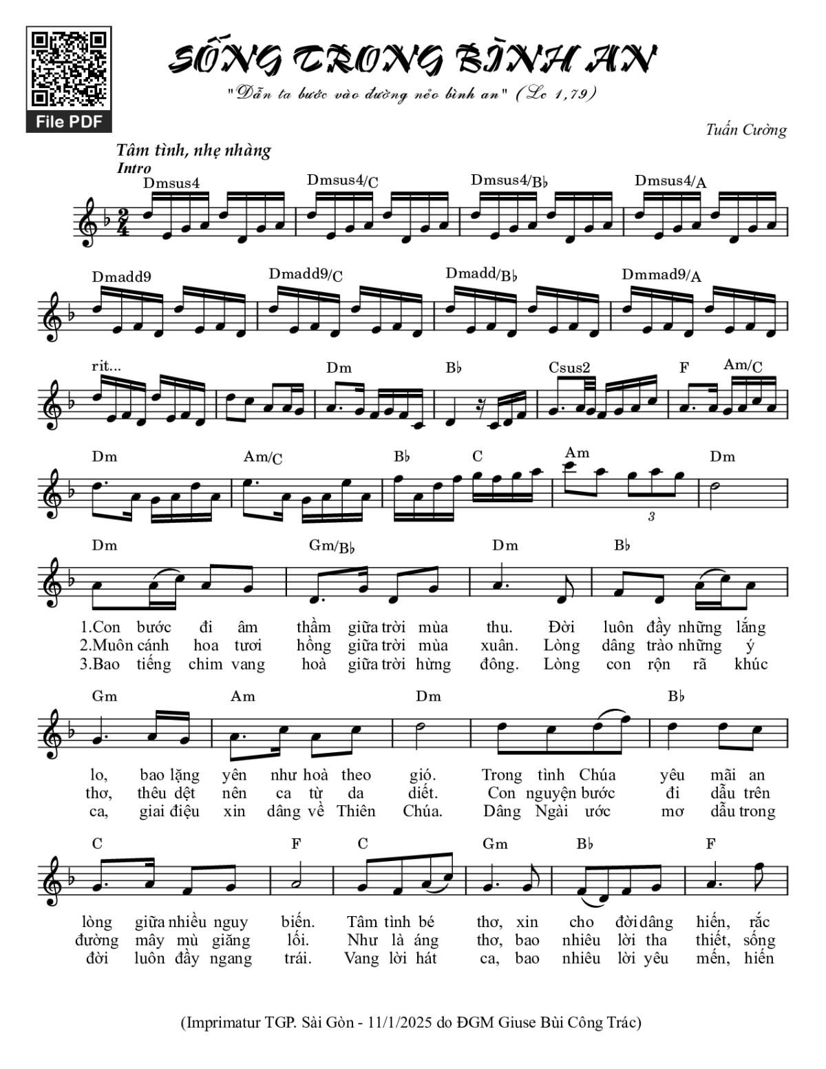 Sheet music sống trong bình an by Tuấn Cường and PDF file was posted here to support you to practice singing perfectly. Sheets with notes and chords are for reference only, for non-commercial purposes only, not involved with earning money by buying and selling. Copyright is belong to song writer/author and copyright owner. Truongca.com do not own any copyrighted content. You can download the high-quality PDF files which contain staffs by PDF link above.